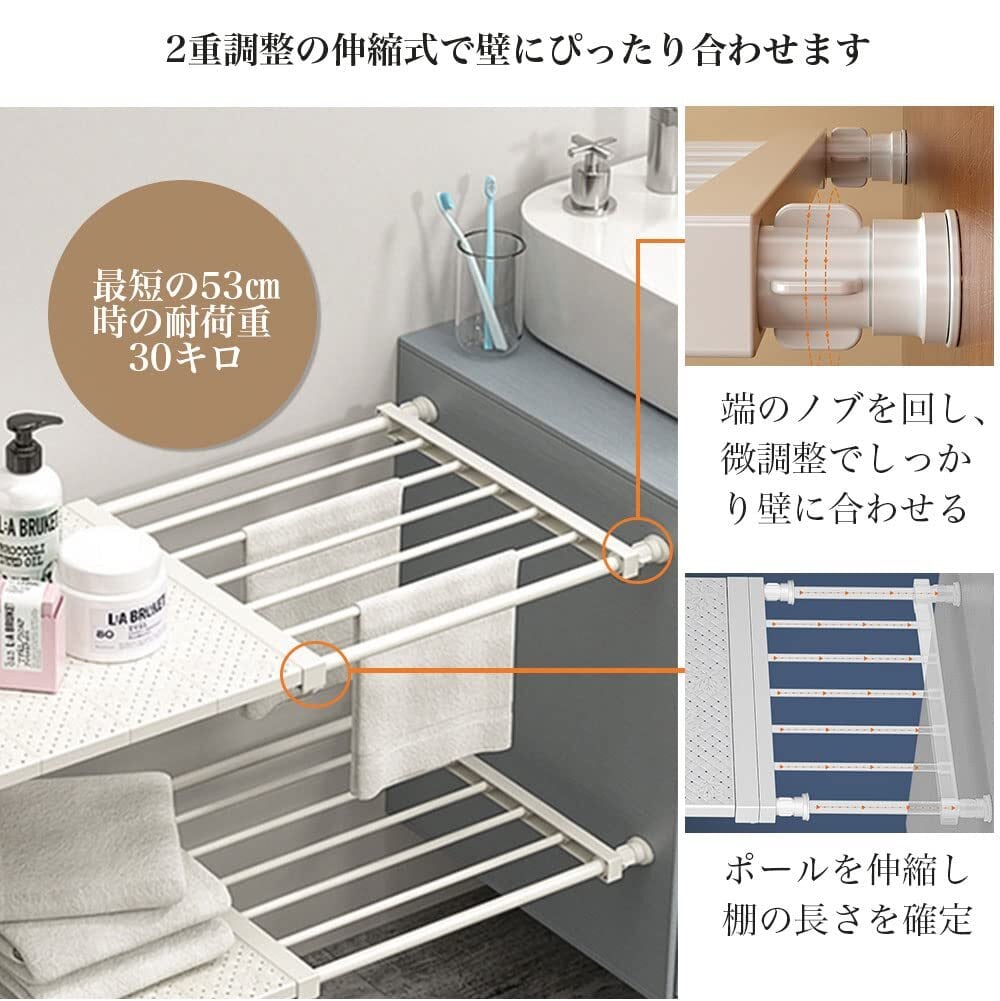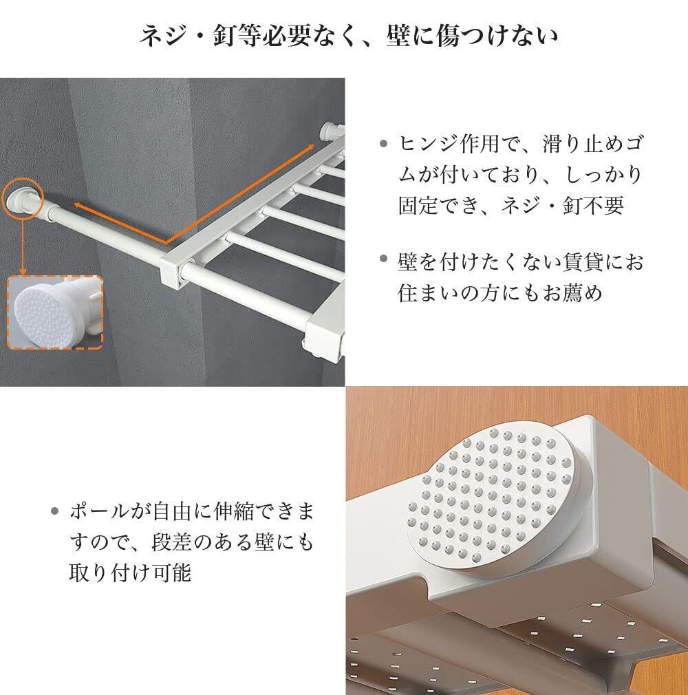 【改良型・強力突っ張り棚】材質 パイプ:鉄製 エポキシ樹脂粉体塗装樹脂部品:ABS樹脂 合成ゴム 耐荷重:約15-30kg(最短時30kg、最長時15kg)。変形しにくく、裂けませんきれいに磨き、安定性が高いです。つっぱり棚は ステンレス+ABS樹脂 合成ゴム 製なので、水分等を触れてもサビやカビが出ないです,恒久耐用です。