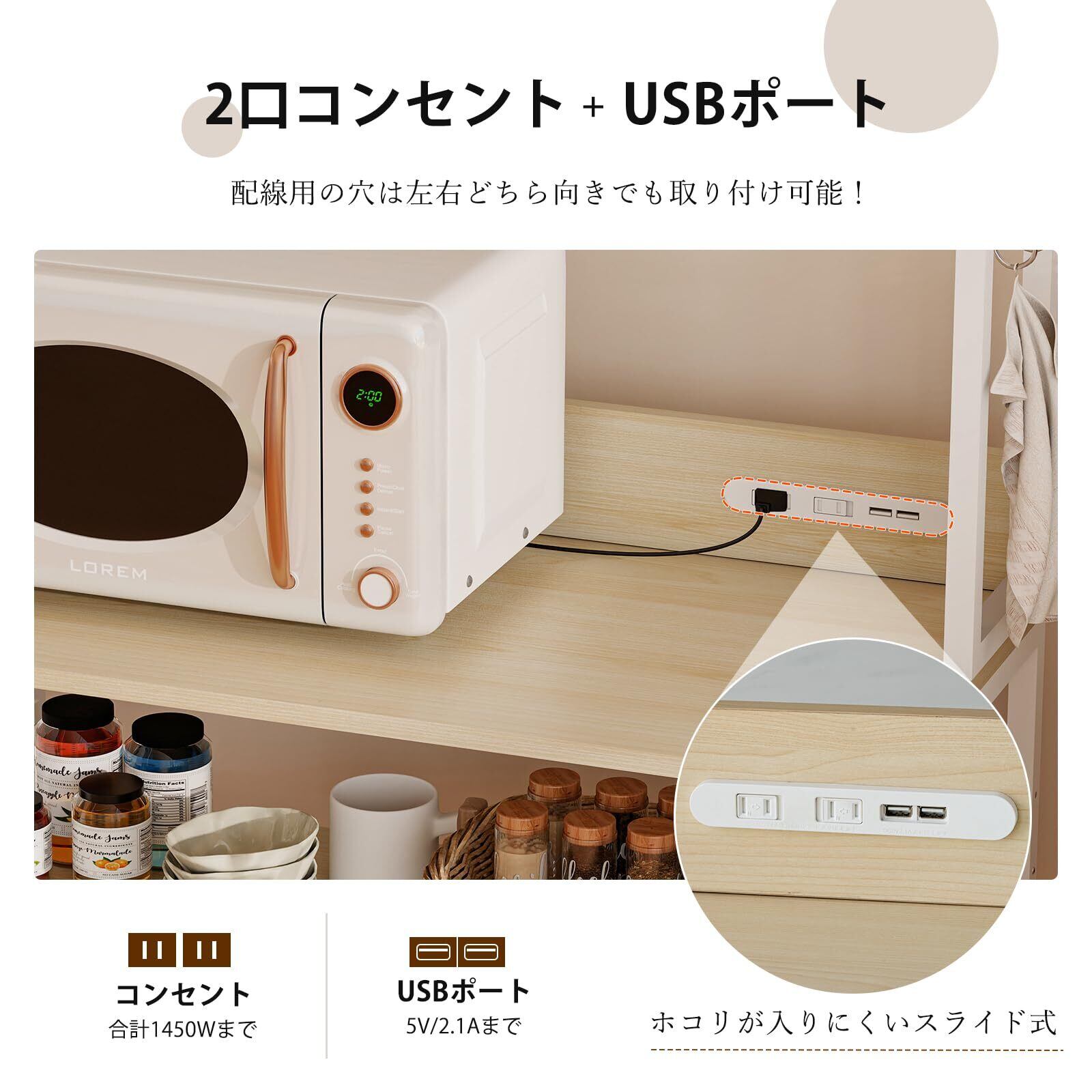 【合計4口!コンセント付きで配線ストレスゼロ】 便利な2口コンセント+USBポート2口を搭載。炊飯器、電子レンジ、コーヒーメーカー、電気ポットなどを同時に使える。コンセント位置は上下左右に自由設置でき、配線もすっきり整理。