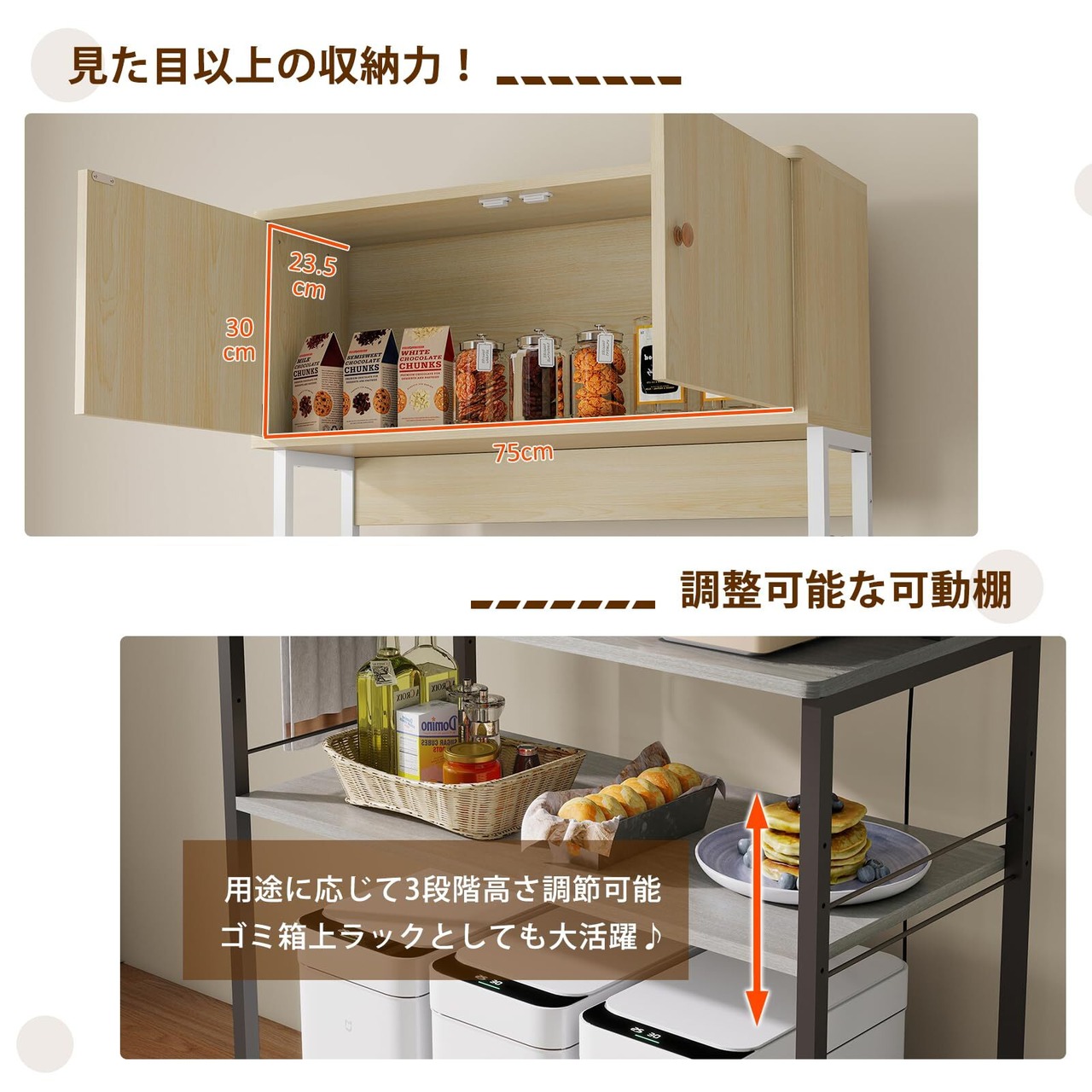 【ゴミ箱上収納&高さ調整棚で自由レイアウト】 最大45Lのゴミ箱を3つまで並べて置けるゴミ箱上ラック設計。下段棚は3段階で高さ調整可能で、分別ゴミ箱やキッチンワゴン、ストック収納など用途に合わせてレイアウト自由。キッチンのデッドスペースを有効活用し、省スペースで大容量収納を叶えるキッチンラック。