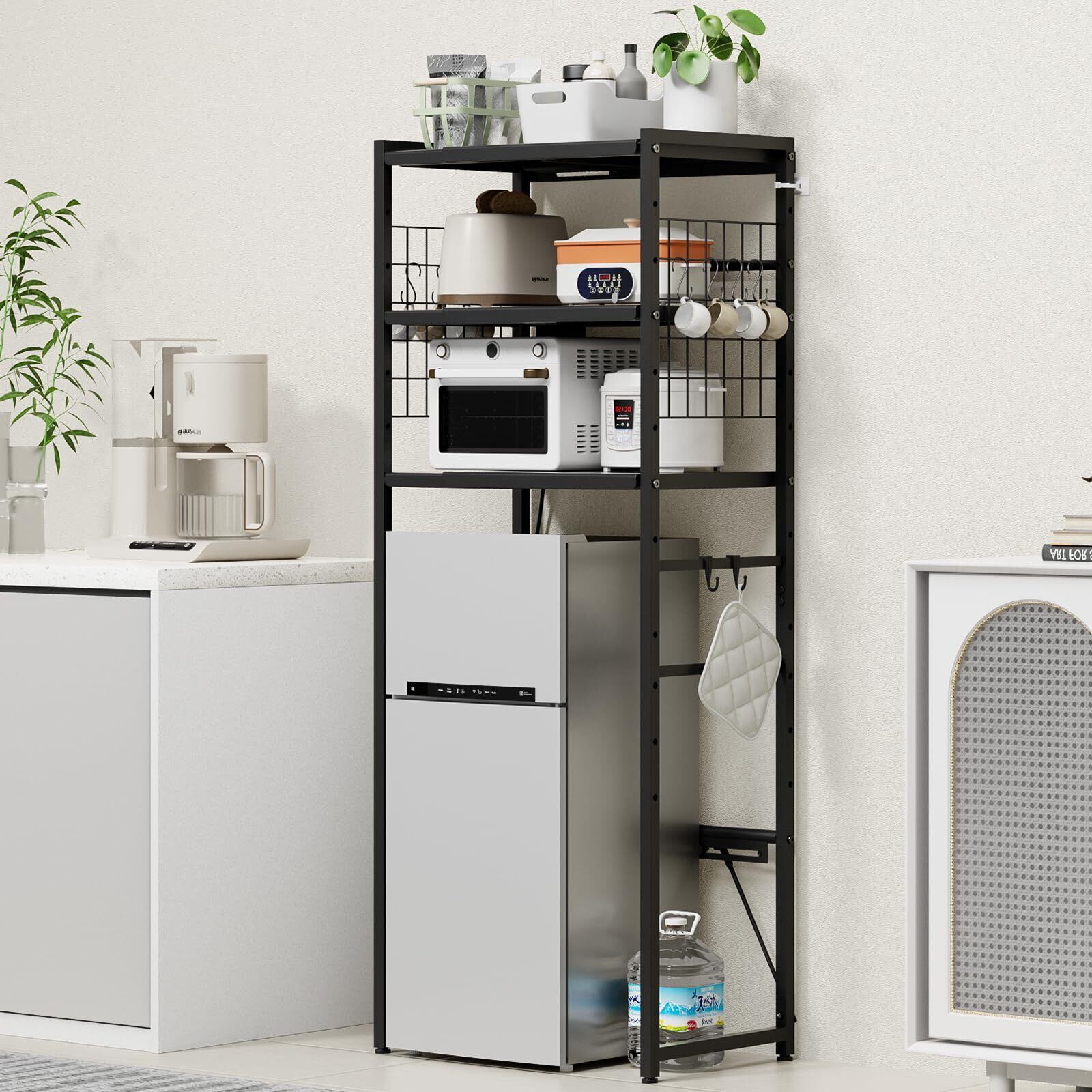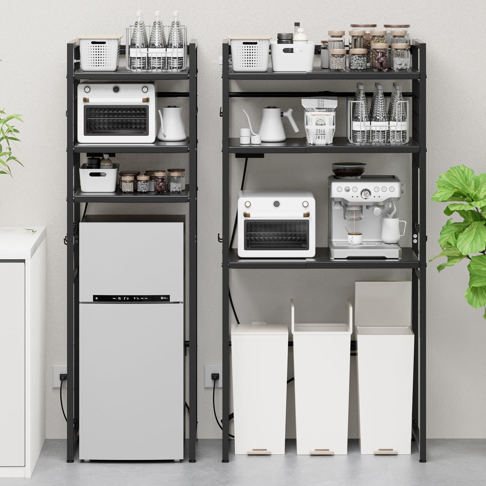 TKUIN ゴミ箱上ラック 冷蔵庫上ラック 【幅50~80cm伸縮可・2口コンセント付き】電子レンジラック 洗濯機ラック レンジ台 棚高さ調整可 トースター置き台 多機能 伸縮キッチンラック 3段 キッチンボード 収納棚 収納ラック レンジボード ランドリーラック スチール スリム おしゃれ 整理 北欧 フック12個付き 両方にワイヤーネット収納 (Black)