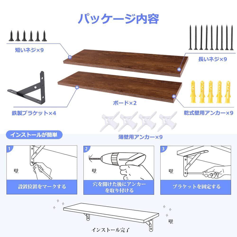 【取り付けが簡単な壁掛け棚】セットには、ボード×2、金属製ブラケット×4、長ネジ×9、短いネジ×9、乾式壁用アンカー×9、薄壁用アンカー×9、日本語取扱説明書×1が含まれています。ウォールシェルフの底には4つの小さな穴が開けられており、誰でも簡単に取り付けることができます。
