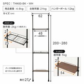 耐荷重:全体耐荷重21kg/伸縮式ハンガーポール12kg/かご1つ当たり2kg/シェルフ5kg