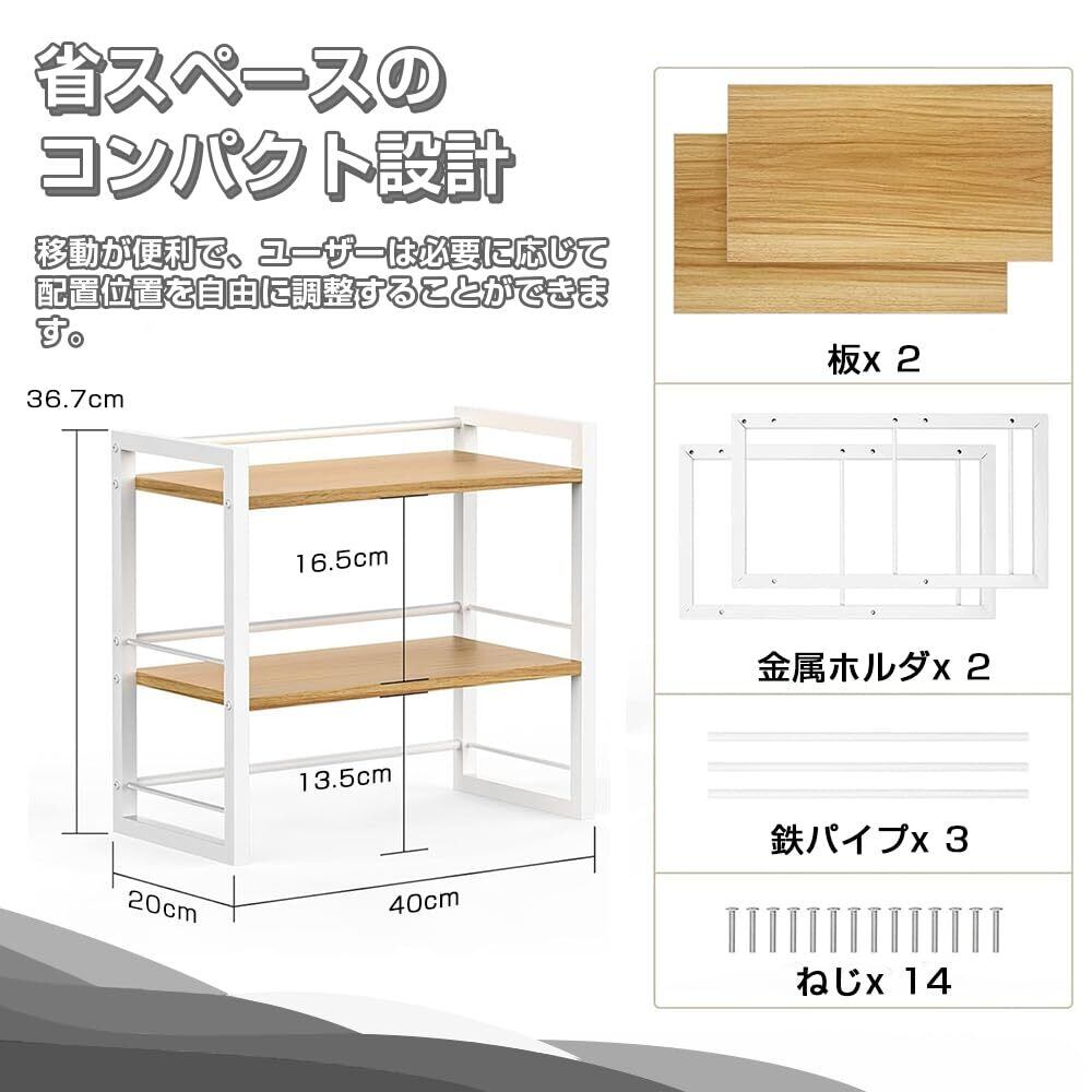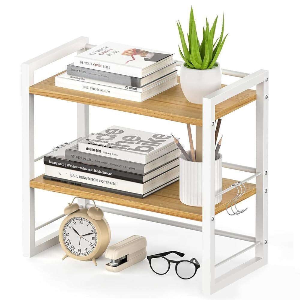 LIKENNY 卓上収納棚 デスク上 本棚 ハンガー付き 2段式 キッチン収納 調味料置き 小型棚 机上用 パソコン台 PCスタンド 高さ調整可能 43×20×43cm (ホワイト)