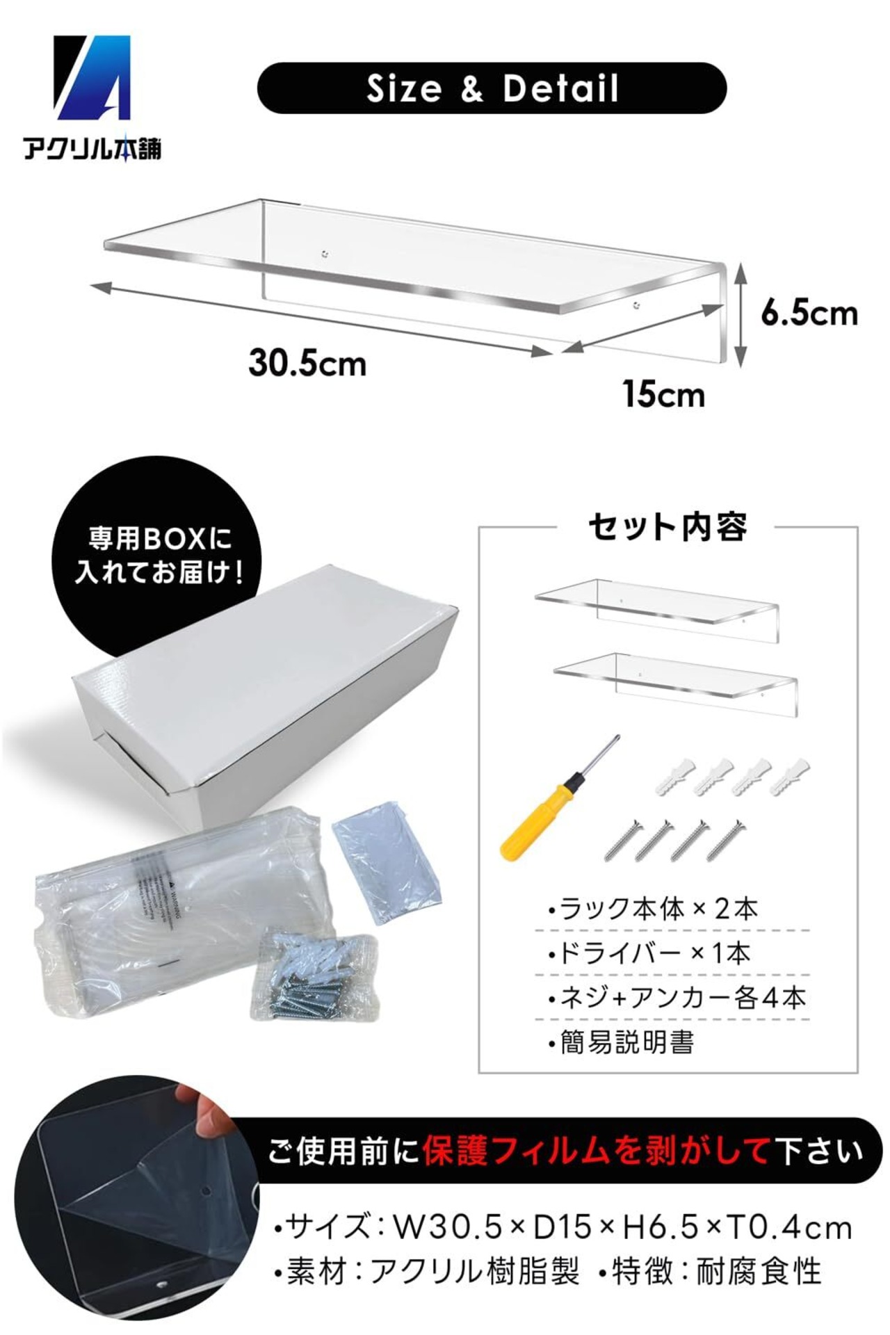 【商品サイズ】30.5×15×6.5㎝ 厚み:4mm【付属品】・シェルフ本体×2個 ・ネジ・ネジ受け ・ドライバー ・簡易説明書