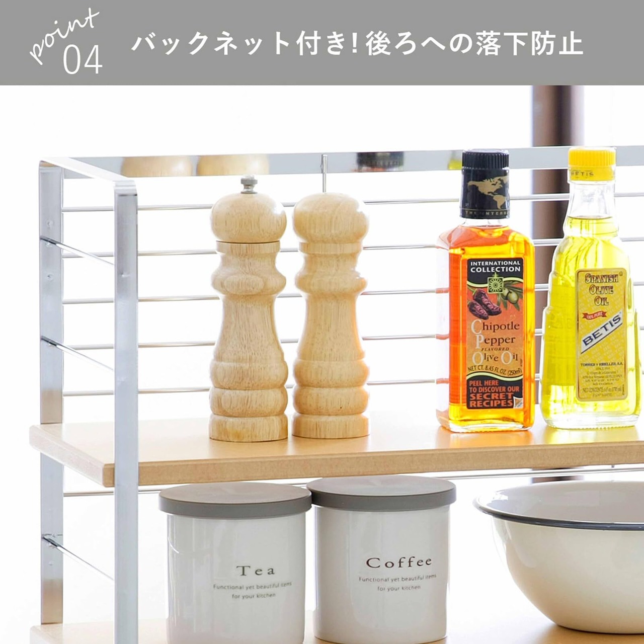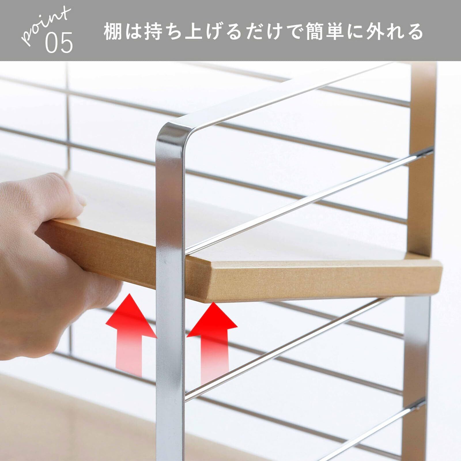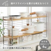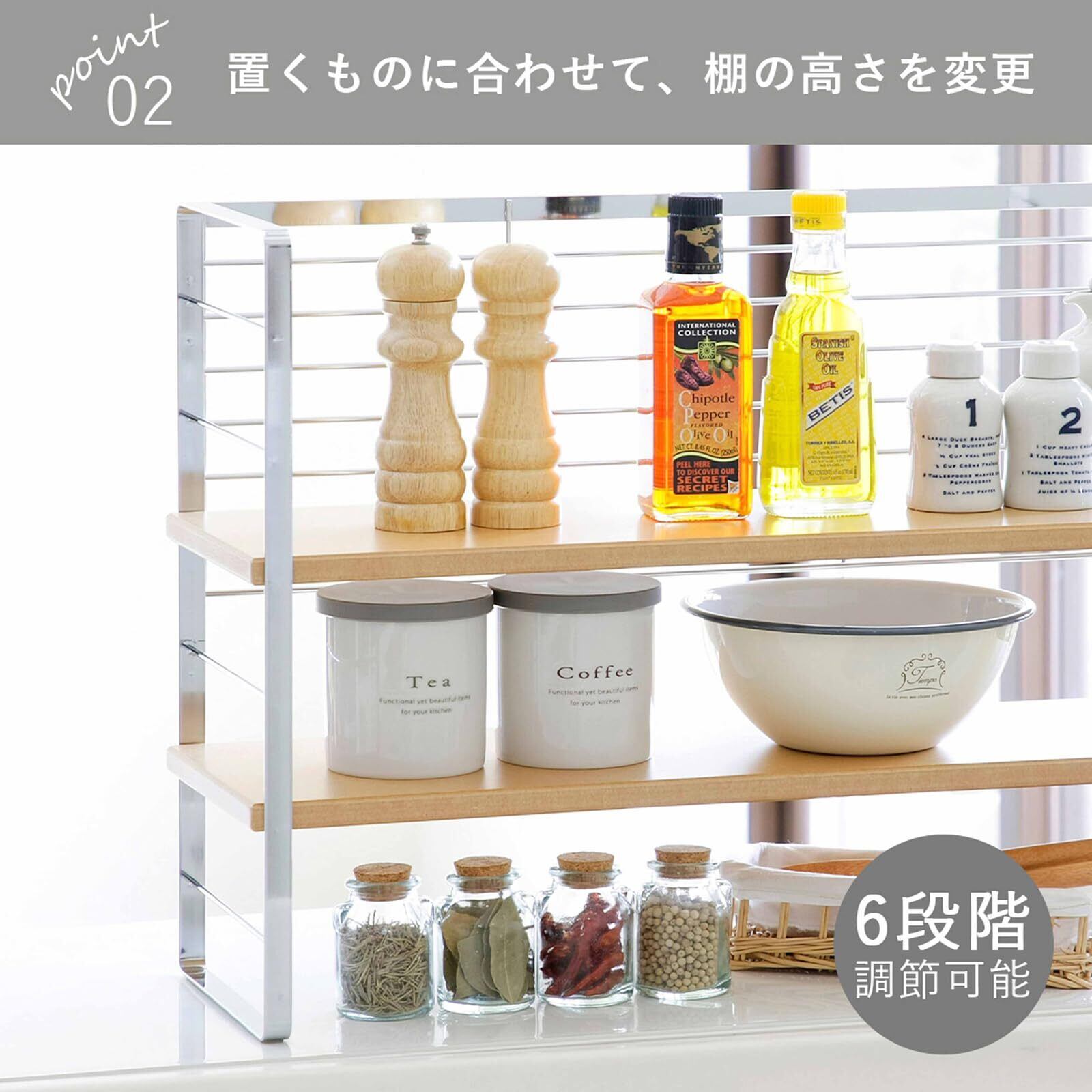 出窓スペースを利用して、鍋や調味料などキッチン道具を収納。バックネット付きで後ろ落ち防止。6段階に高さ調節可能。 品番 30750 材質 フレーム・バックネット:スチール(クロムメッキ)、棚板:MDF(中質繊維板)ウレタン塗装、クッションゴム:シリコンゴム サイズ 幅60×奥行20×高さ43cm、棚板:幅60×奥行19×高さ1.5cm(6段階調節可能6.5cm間隔) 重量 3.5kg 生産国 日本 JANコード 4957423051712 耐荷重 1段あたり4kg