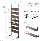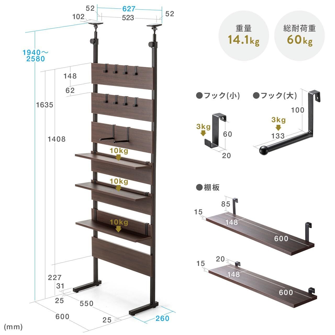 特徴 棚とフック付き、工事不要、パーテーションとしても使用可能、安定した設置