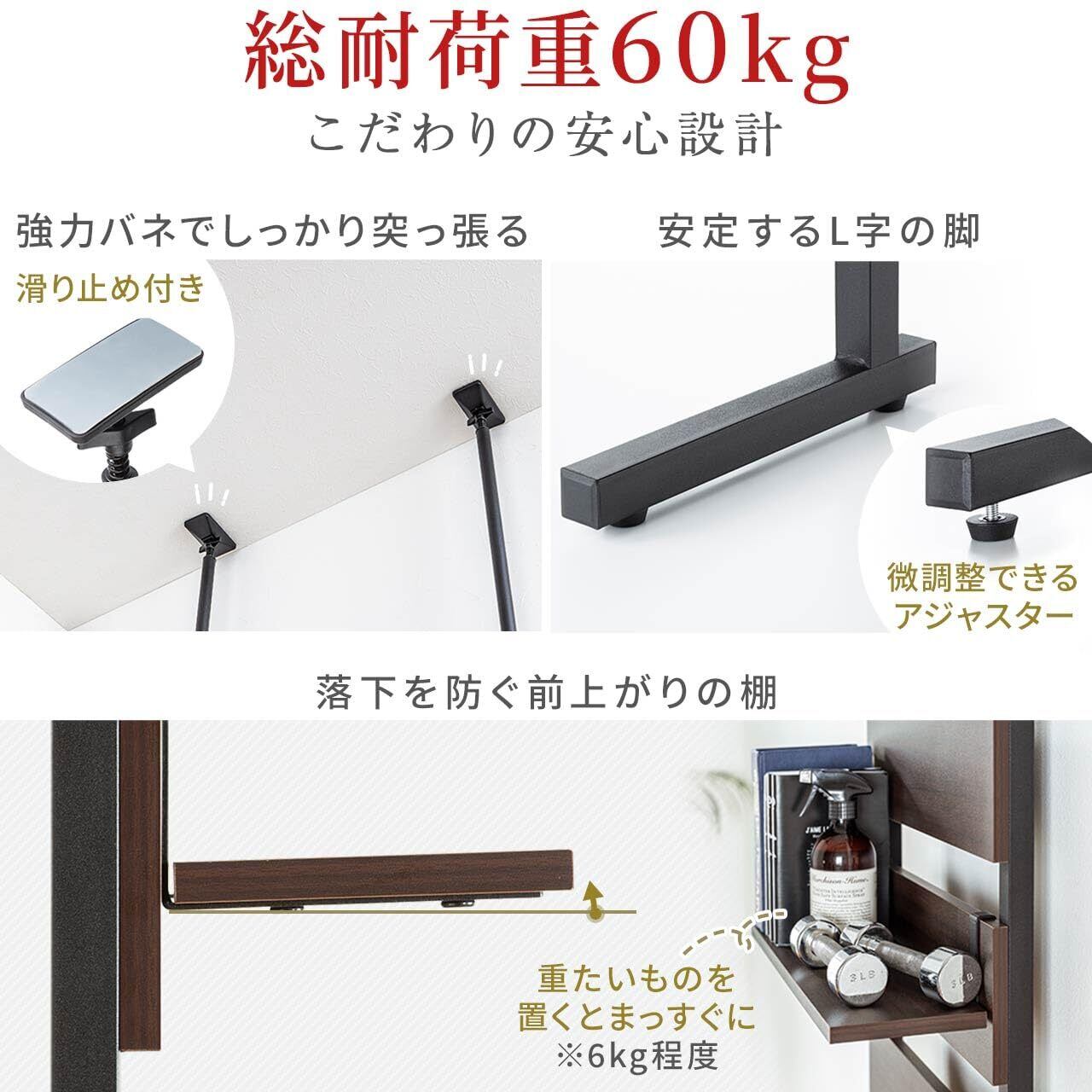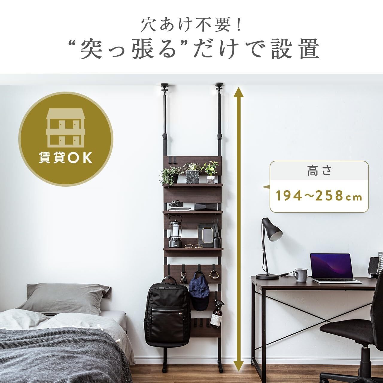 サンワダイレクト 突っ張りラック 棚 幅60cm 壁面収納 高さ194~258cm 棚板3枚・フック10個付き 総耐荷重60kg おしゃれ ホワイト 100-TSF002W