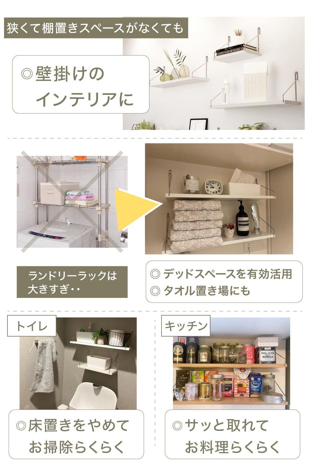 【安心設計】 化粧板素材を使用しているので、汚れや水に強く、お手入れもラクラク。耐湿性・耐候性・耐水性のあるシートを板に張り合わせたキレイな木質の化粧板を使用。水に濡れても拭けるので水回りでの使用も安心。シミになることもありません。小さい30cmから50cm、60cm、90cmと4種類の長さがあります。カラーもブラック、ホワイト、ナチュラル(木質)からお選び頂けます。奥行き15cm。お部屋のスペースや置きたい物でお選び頂けます。取り付け後も小さな針穴(画鋲くらい穴)が空くだけなので、賃貸住宅でも壁を傷つけないで取り付けができます。引っ越しの時の原状回復もらくらくです。