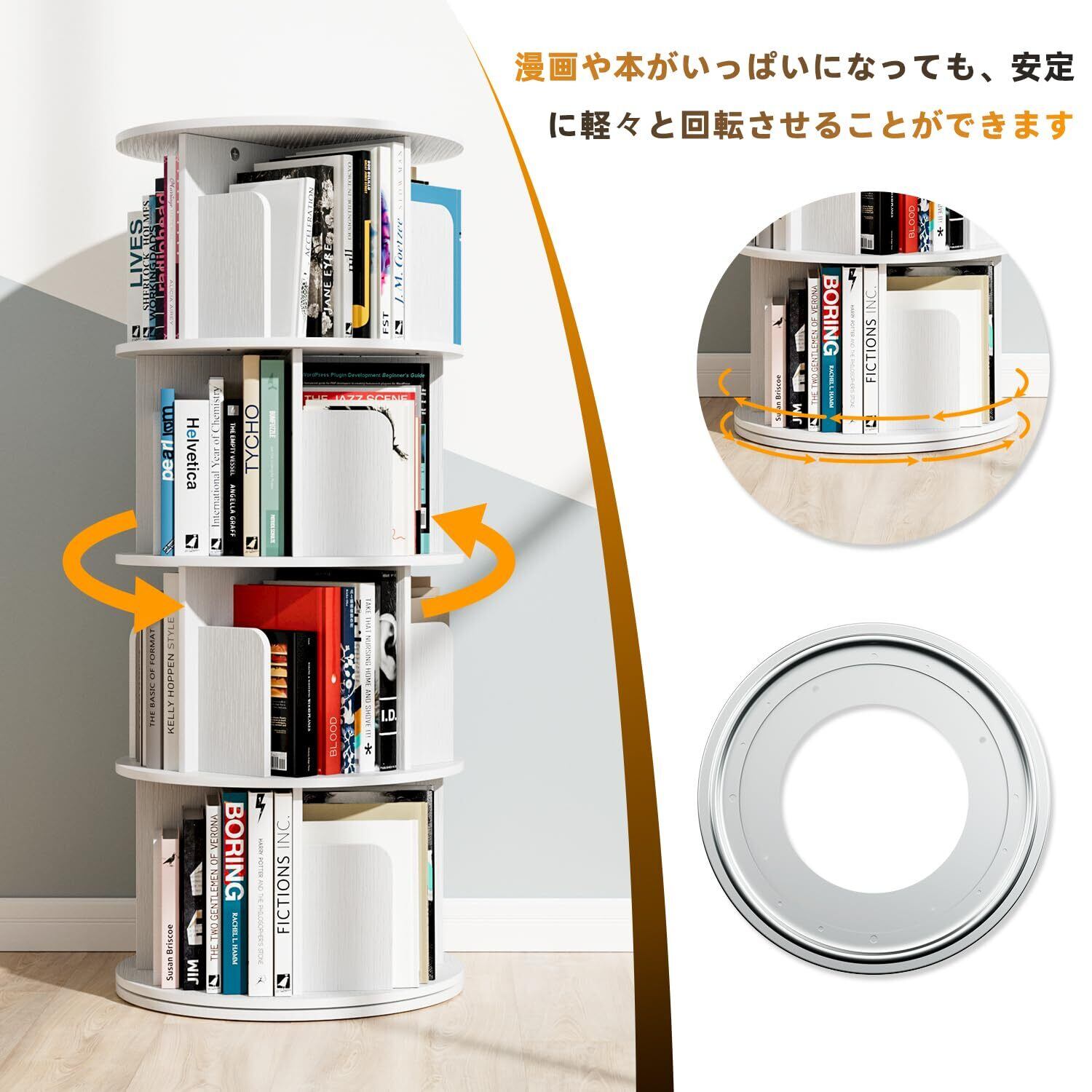 【耐久性の高い回転式本棚】この360度回転式本棚ベースにはベアリングが付いており、傾きや揺れがしにくい。簡単に360度回転して、本を収納または取り出すことができます。本棚は耐久性のある高品質のスラップ板で作られており、水に耐え、湿った布で簡単にきれいになります。ご家族の皆様に持続的で安定したブックストレージを提供いたします。