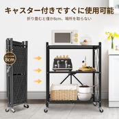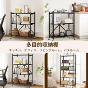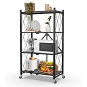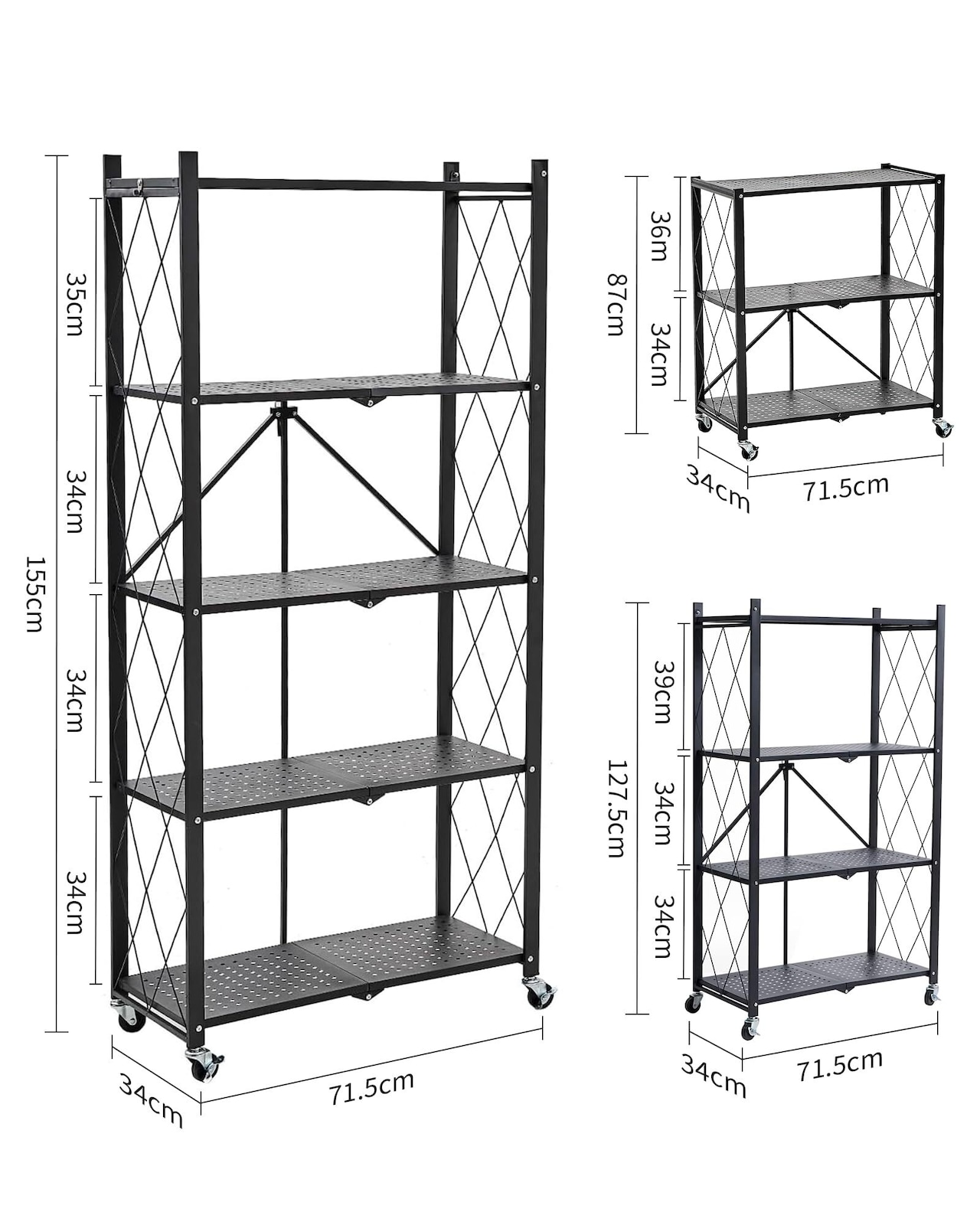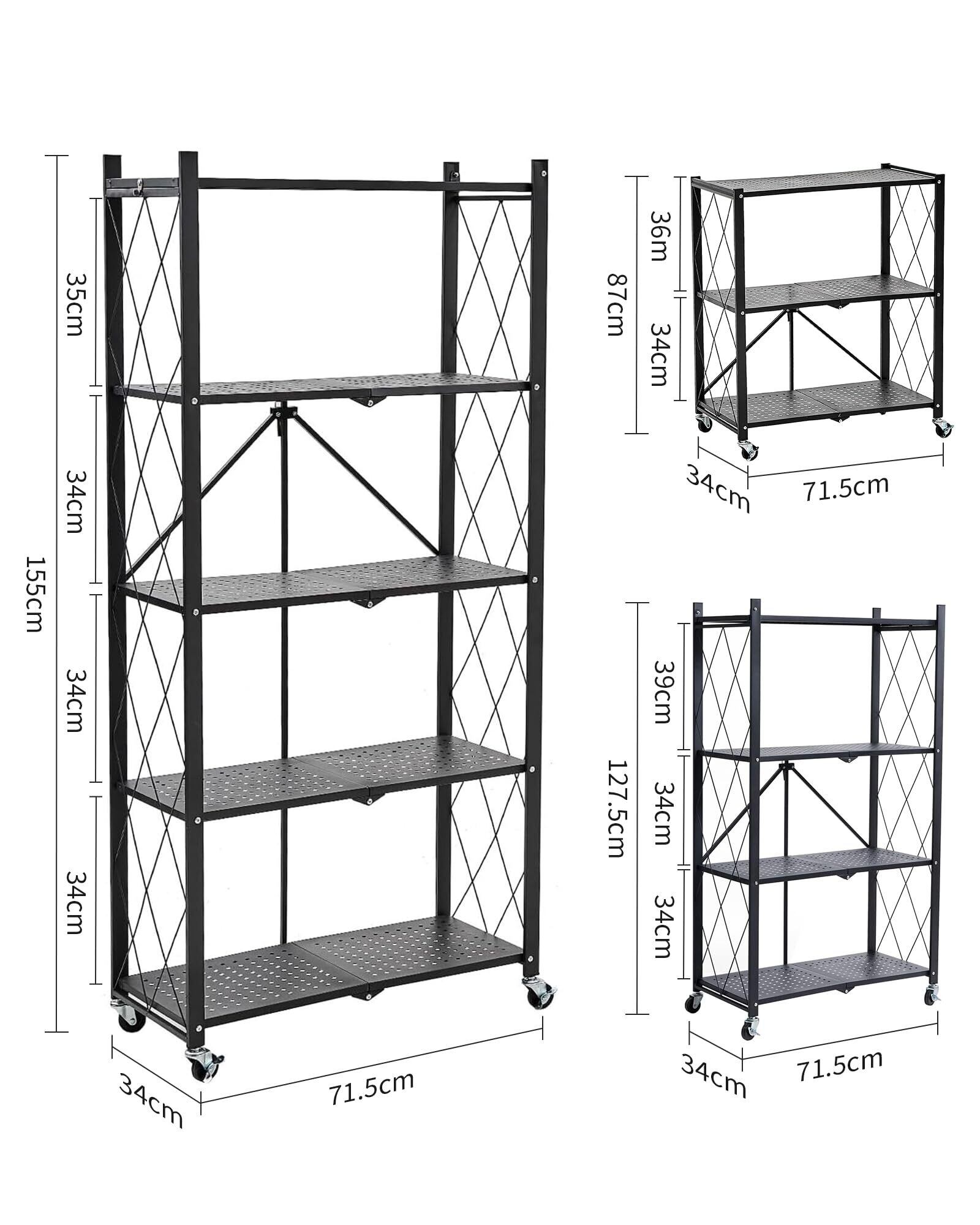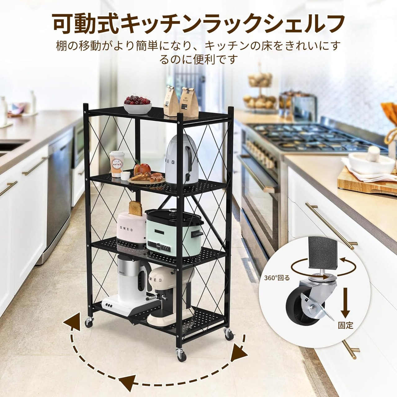 4段 折りたたみ棚 収納ラック スチール 折り畳み メタルラック オープンシェルフ キャスター付き 頑丈なキッチン棚 金属 組み立て不要 Folding Shelf (Black, 幅71×奥行34×高さ127cm)