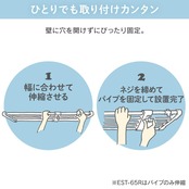 【ひとりでも取り付け簡単】1.幅に合わせて伸縮させる。2.ネジを締めてパイプを固定。3.設置完了!