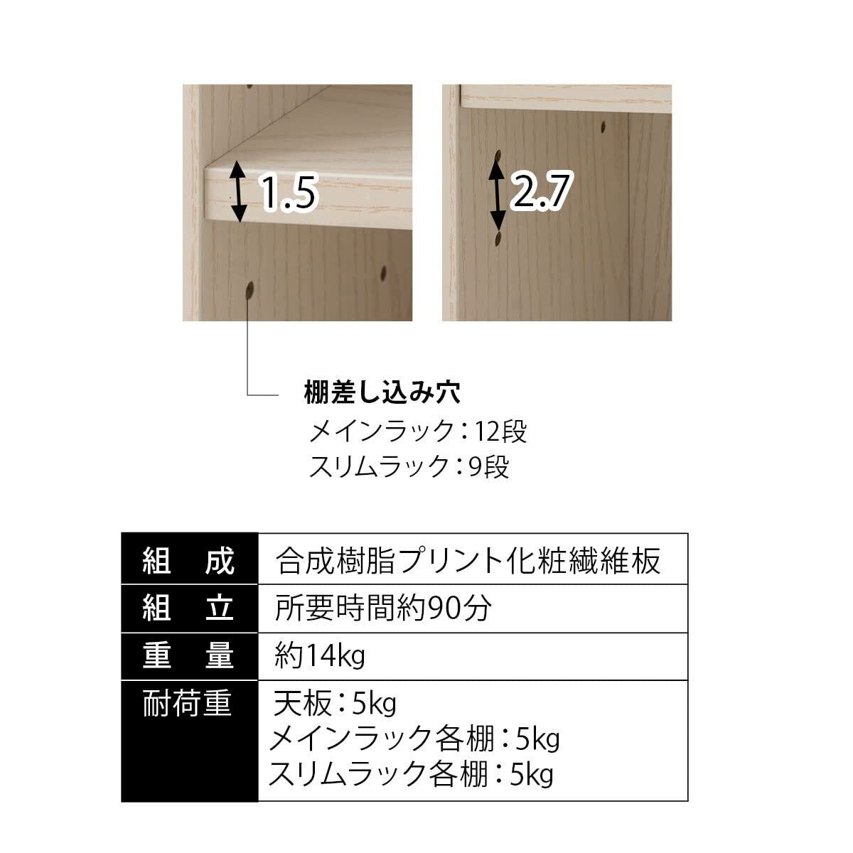 【サイズ】 全体:約幅77×奥行17×高さ60cm/メインラック:約幅60×奥行17×高さ60cm/サイドラック:約幅17×奥行17×高さ60cm 【材質】 合成樹脂プリント化粧繊維板 【カラー】 ナチュラル 【重量】 約14kg 【耐荷重】 天板:約5kg/メインラック:約5kg/サイドラック:約5kg 【組立所要時間】 約90分