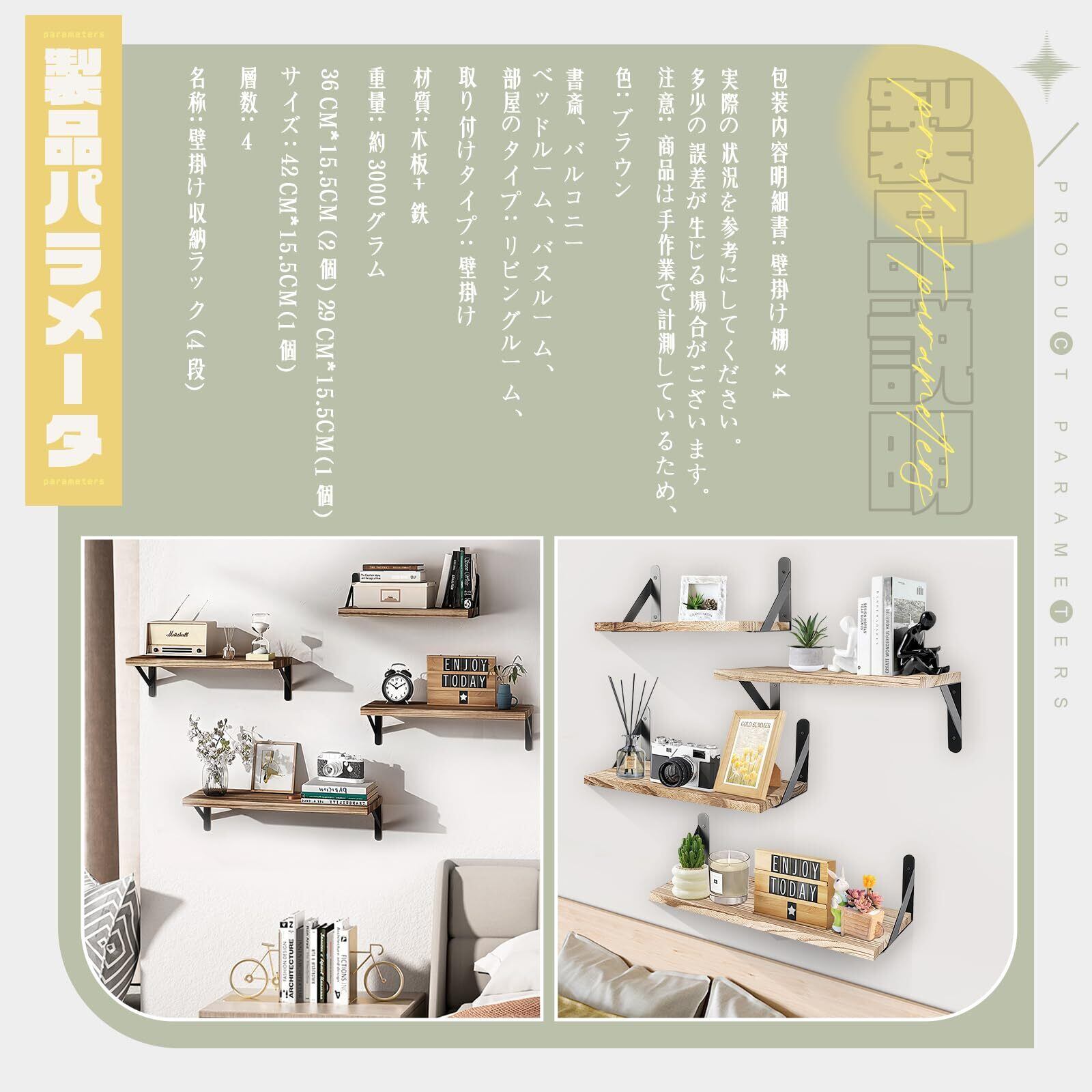 RMNKTHC 壁掛け棚 4個セット 天然木製 ウォールラック 耐荷重18kg DIY組み立て式 大容量収納 炭焼き仕上げ 粉体塗装 防湿設計 キッチン/リビング/洗面所対応 壁面収納ラック 賃貸可 飾り棚 吊り棚 おしゃれ(ライトブラウン4点セット)