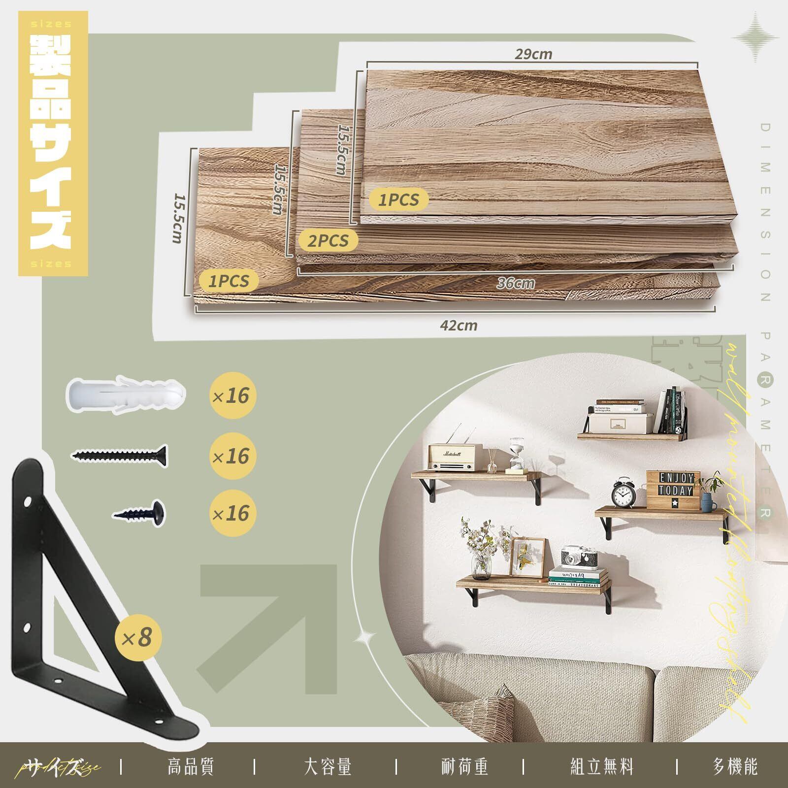 【大容量ウォールラック】:1つのセットには4つの壁掛け棚が含まれます。個別に使用することも、組み合わせて利用することも可能です。当社の吊り棚は一般的な棚よりも幅広く長いため、より多くの収納スペースを提供します。壁面収納 棚のサイズは、42cm(1枚)、36cm(2枚)、29cm(1枚)で、すべての奥行きは15.5cmです。この広い収納スペースにより、小さなアイテムが落ちる心配はありません。