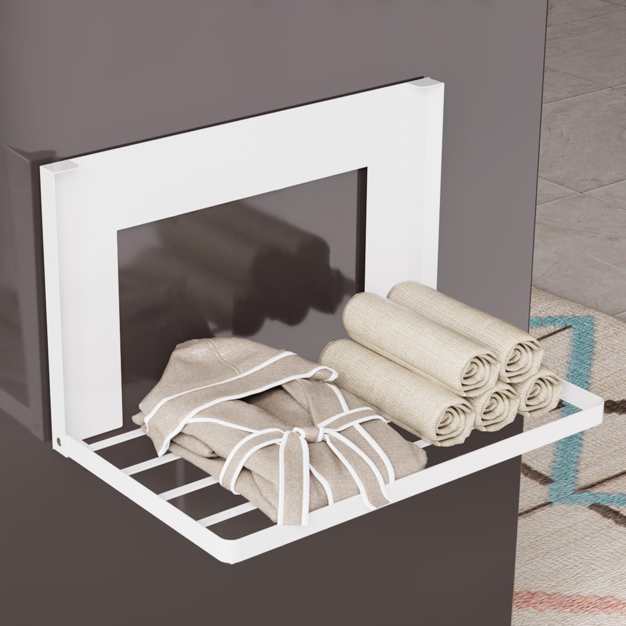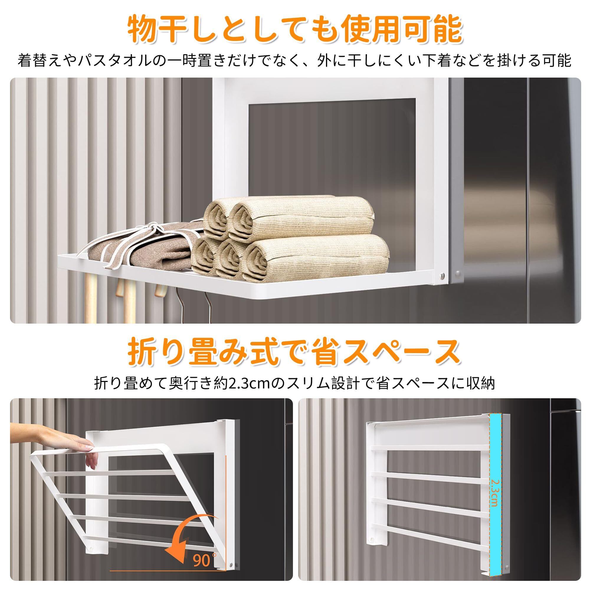【マグネットで簡単取り付け】取り付けや取り外しが穴不要で、壁や家具にキズを付けずに設置できるマグネット棚です。洗濯機の置き場所やお風呂のドアの位置に合わせて、微調整が可能です。入浴後の着替えやバスタオルなどを一時置きできる便利な折り畳みラックです。外に干しにくい下着などを掛けて干すこともできます。