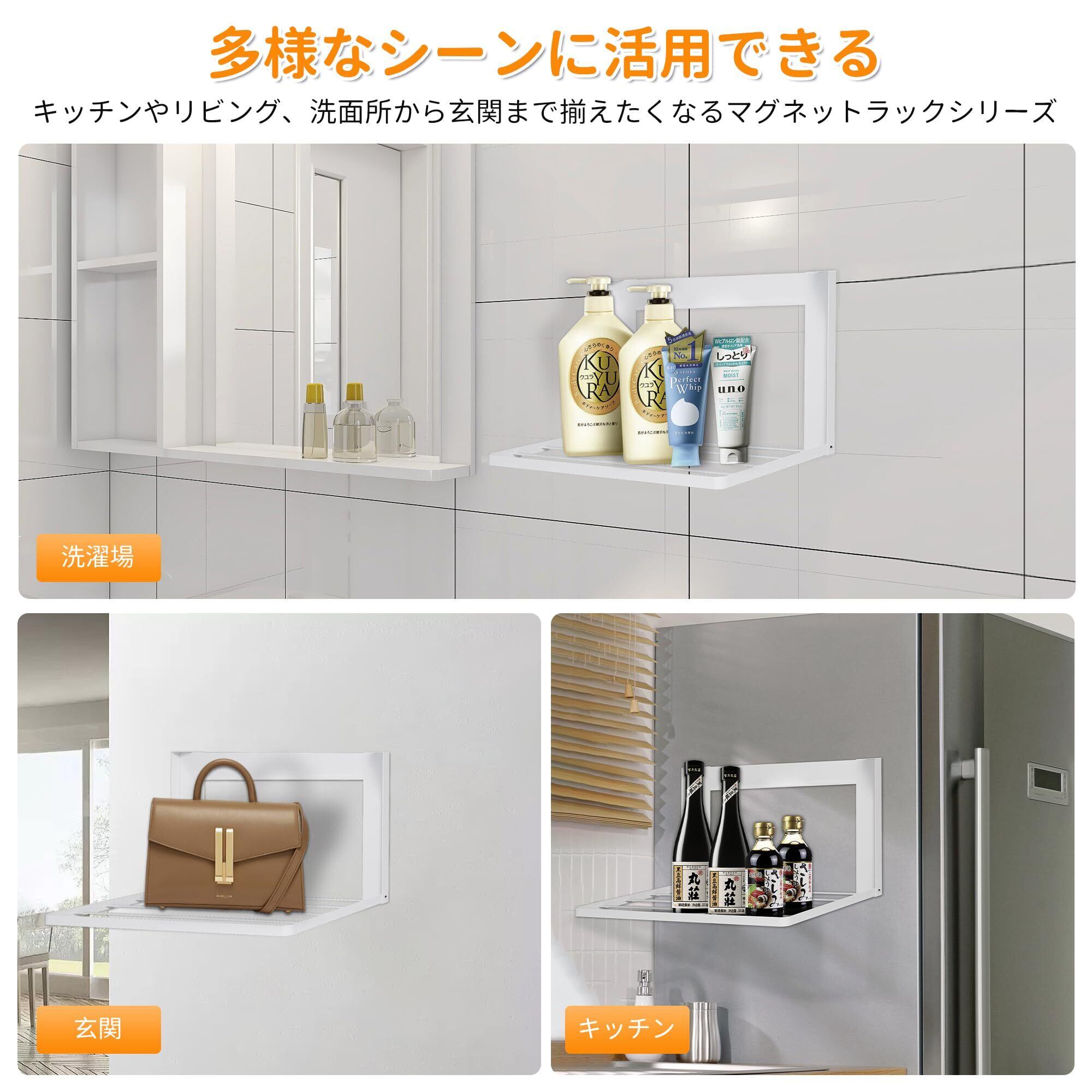 【上質なステンレス素材】マグネット折り畳みラックは高強度のステンレスで作られており、表面に粉体塗装で処理され、バスルームの湿気や水に強い耐久性を実現。お風呂バスラックとして、錆や腐食の心配がなく、長期間使用しても美観を保ちます。濡れたタオルや洗面用具を置いても、自然乾燥が可能で衛生的です。洗濯機だけなく、冷蔵庫の横に貼って、海苔やスナックの袋などをのせて使えます。スペースを有効活用できています。