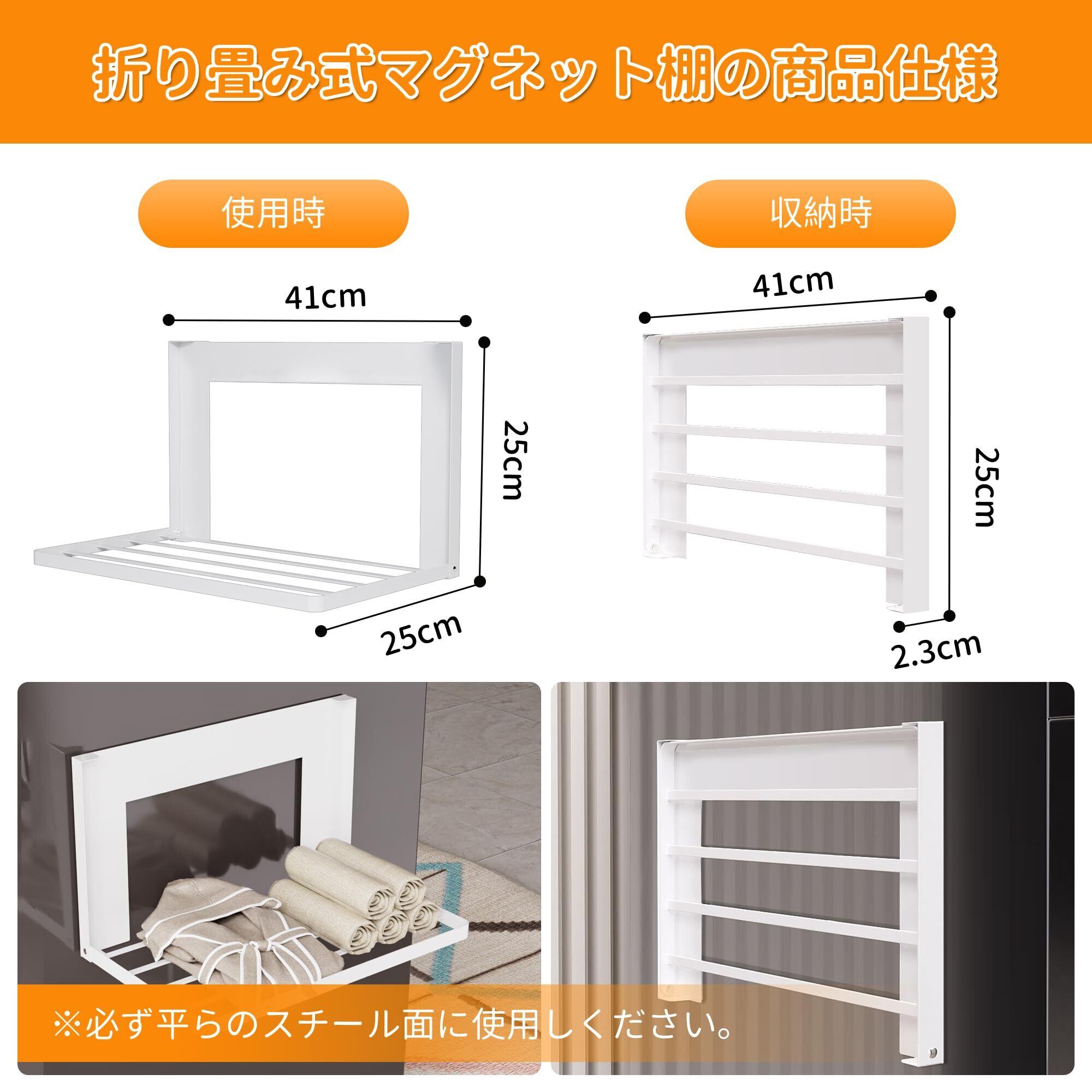 【折り畳み式マグネット棚の商品仕様】サイズ:(使用時)約W41XD25XH25cm、(収納時)約W41XD2.3XH25cm。本体重さ約1.5Kg、耐荷重5kg。※必ず平らのスチール面に使用しください。ご購入の前必ず取付環境をご確認ください。