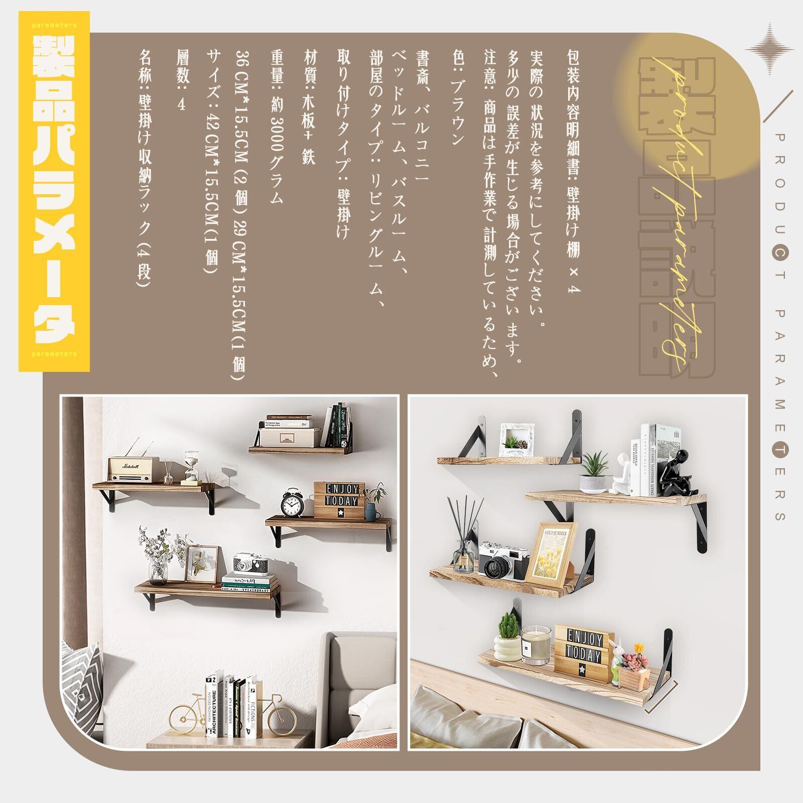 【マルチファンクション収納】4つの壁つけ棚は、あなたの収納ニーズに対応します。リビング、エントランス、寝室、キッチン、バスルーム、オフィスなど、さまざまな場所で小物を収納するのに非常に適しています。写真、コレクション品、小型観葉植物などを壁棚に置き、家を整理整頓し、美しく保ちましょう。
