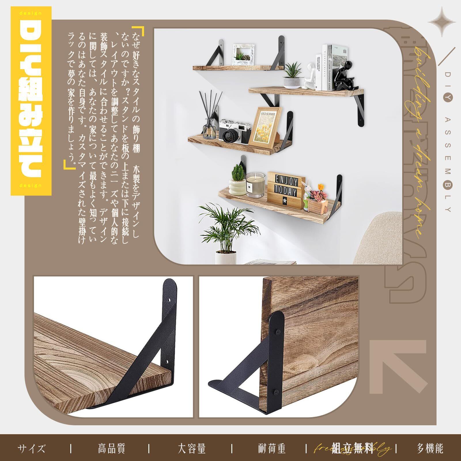 【DIY組み立て】なぜ好きなスタイルの飾り棚 木製をデザインしないのですか?スタンドを板の上または下に接続し、レイアウトを調整してあなたのニーズや個人的な装飾スタイルに合わせることができます。デザインに関しては、あなたの家について最もよく知っているのはあなた自身です。カスタマイズされた壁掛けラックで夢の家を作りましょう。