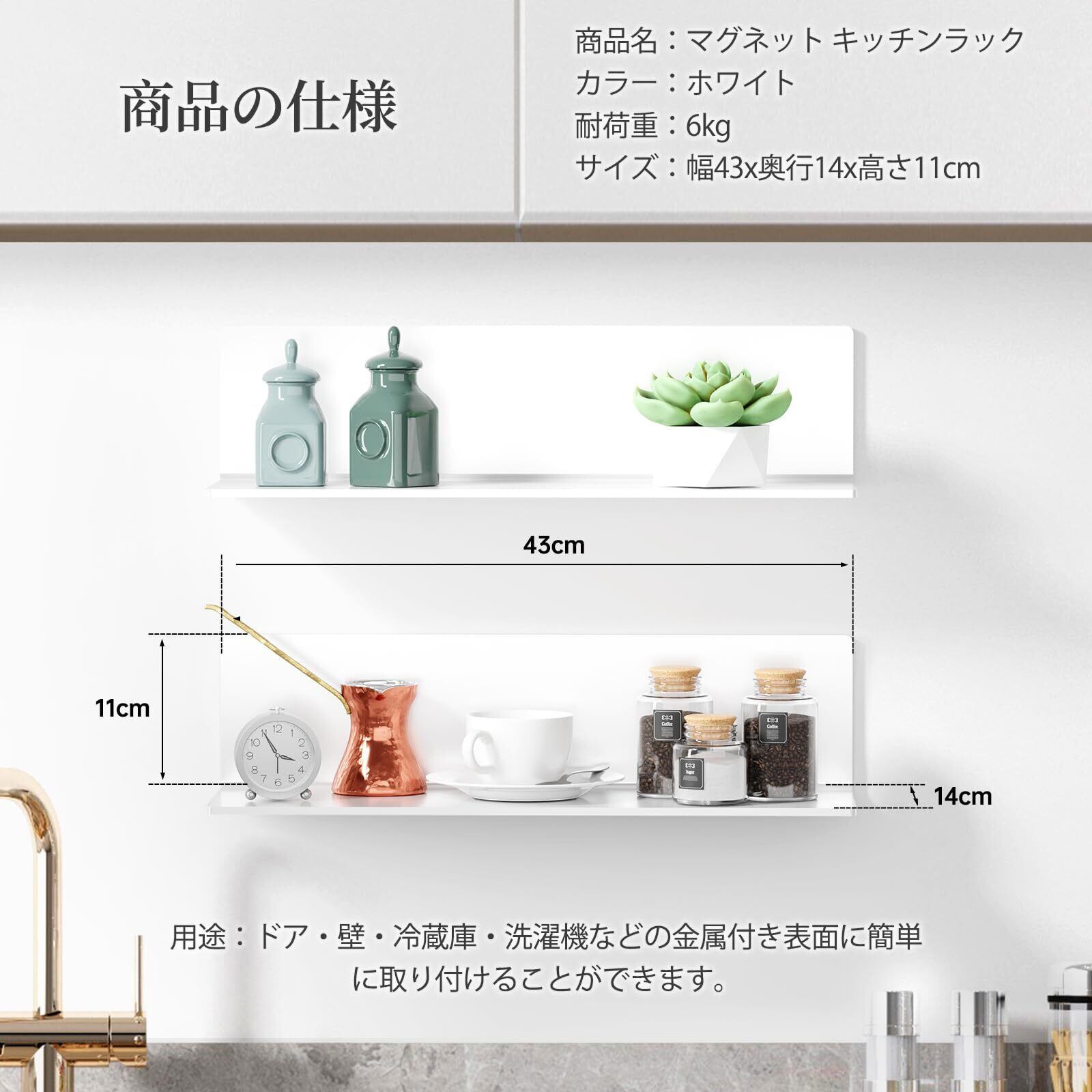 【高品質のアクリル製】マグネットラックは高品質のアクリル製で、防水、防錆、お手入れが簡単。耐久性に優れ、変形の心配もありません。本体サイズ:約幅43x高さ11x奥行き14(cm)、棚内寸:約幅43x奥行き13(cm)、耐荷重約6kg(耐荷重を守ってご使用ください。)