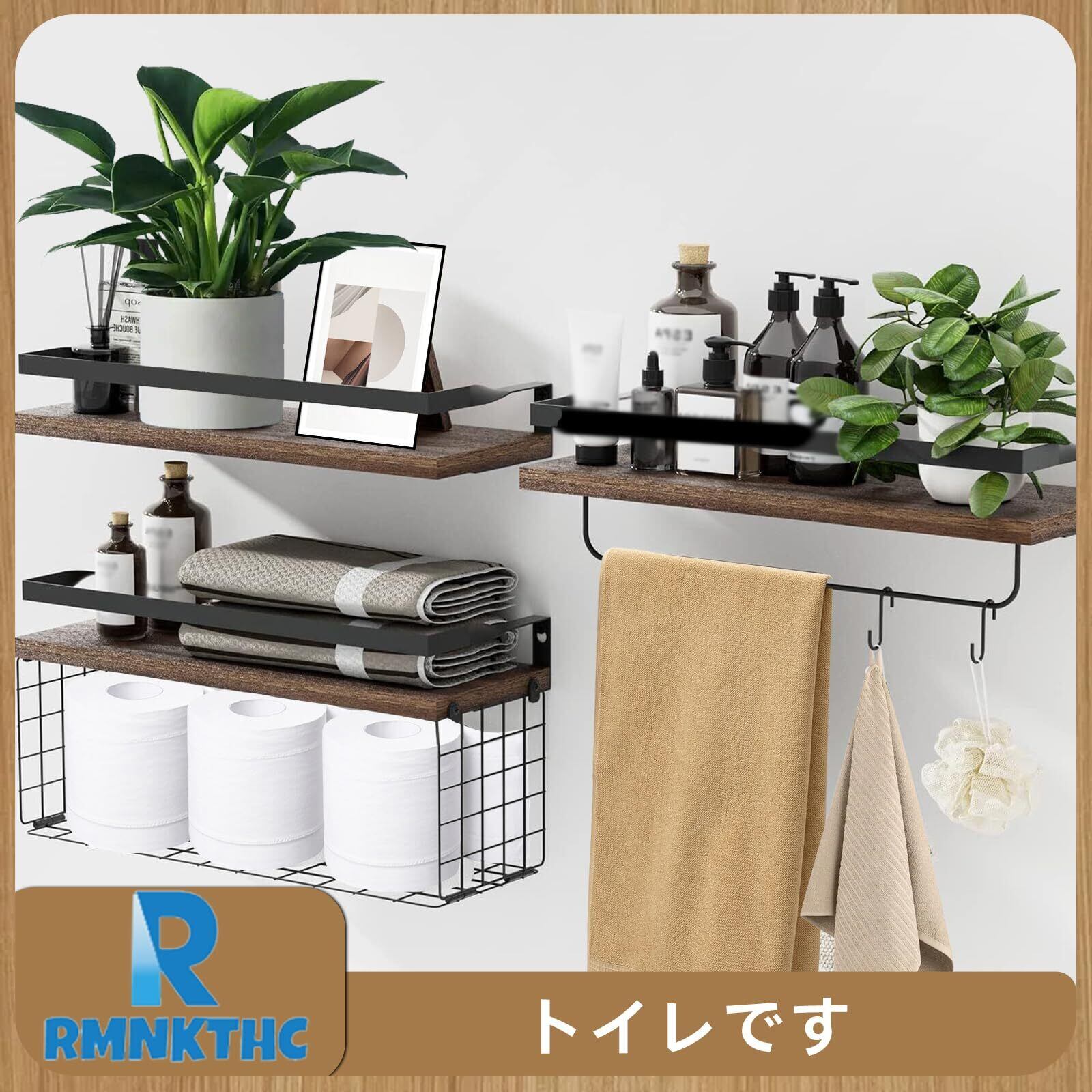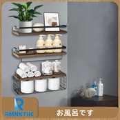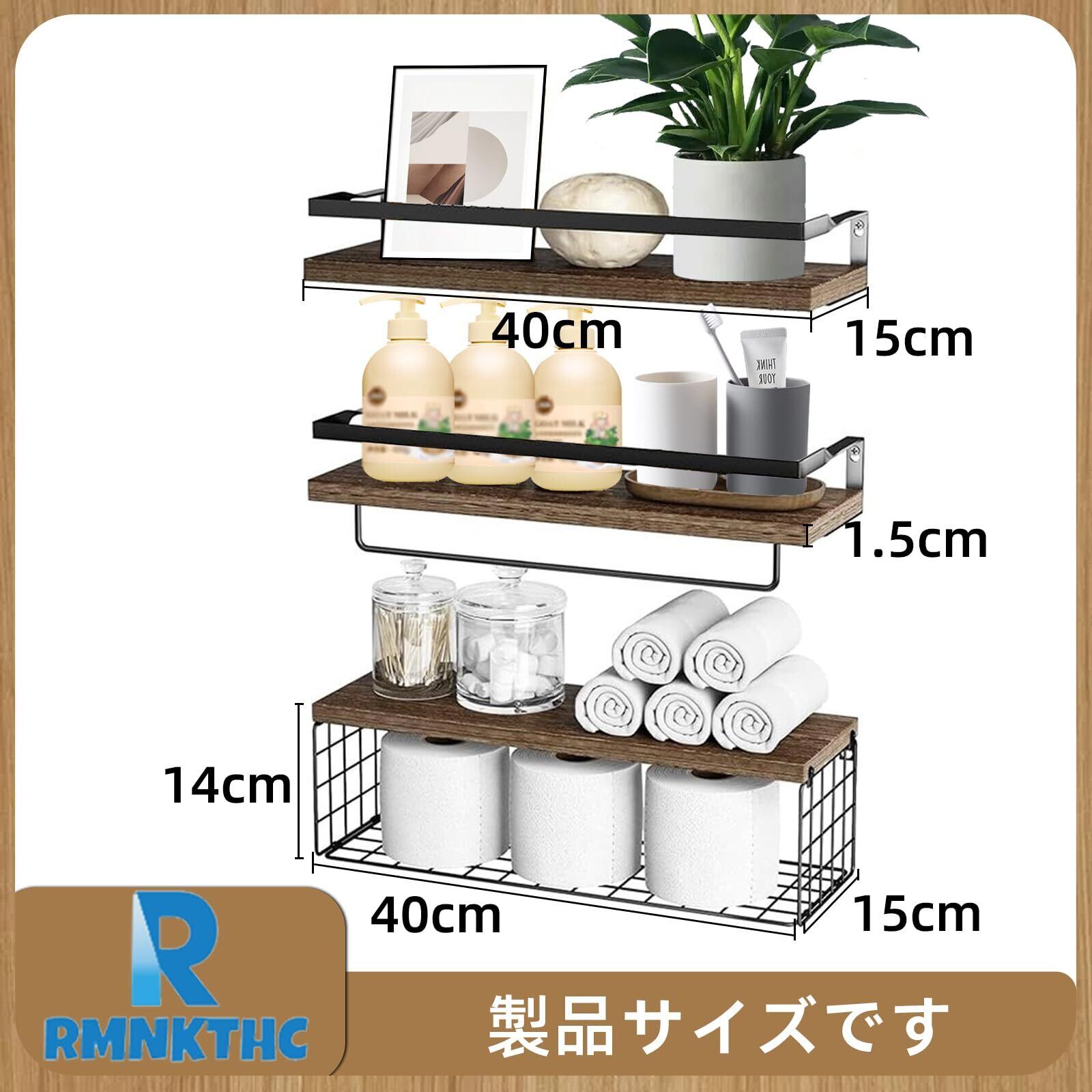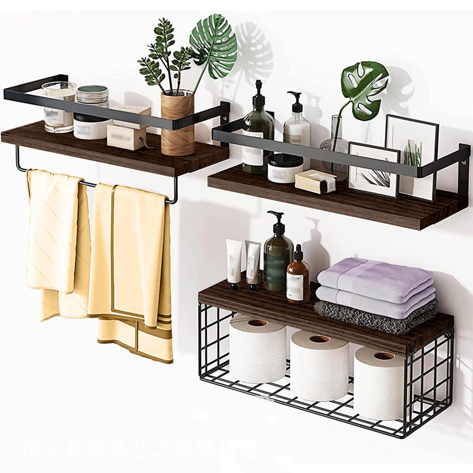 壁掛け棚、ウォールシェルフ、収納バスケット付き 壁 棚 ラック 3個セット 天然木製 おしゃれ 多機能 キッチン/洗面所/トイレ/寝室 取り付け簡単 タオルバー付き(ダークブラウン)