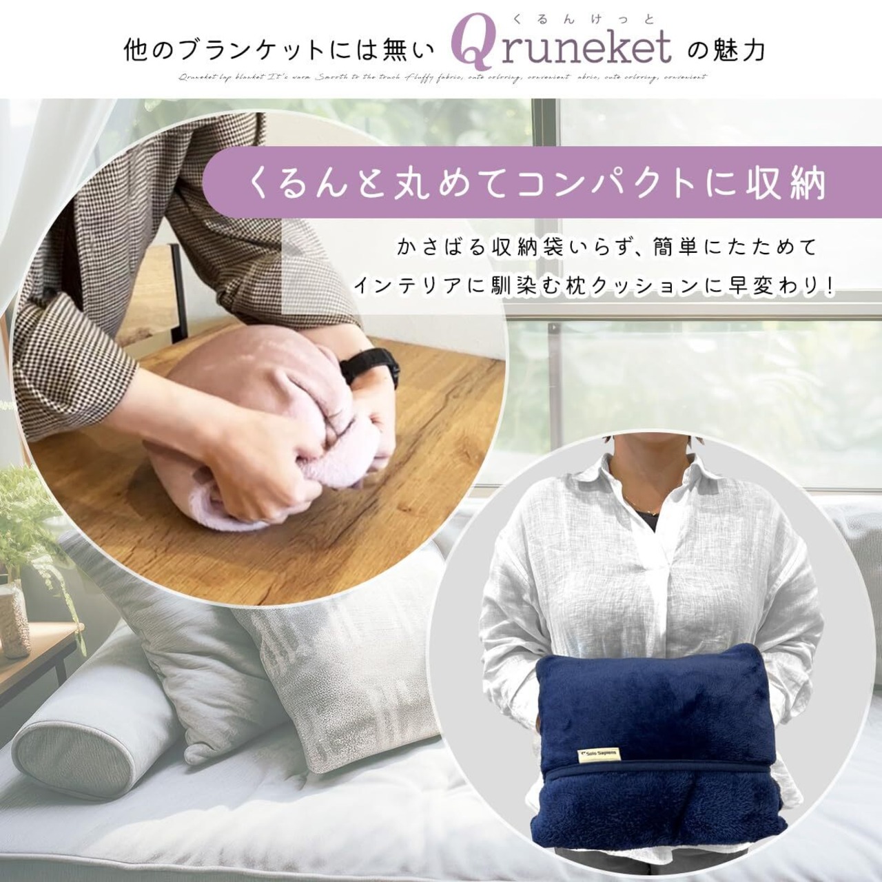 【くるんと丸めてコンパクト】ソロサピエンスのくるんけっと [Qruneket] は、コンパクトに収納可能なブランケットです。140cmx90cmの大判サイズで、毛布やひざかけとして活躍します。生地にはこだわりの極上起毛素材を使用し、手触り抜群。くるんとひっくり返して収納できるポケットを装備。枕やクッションとしても活躍します。収納ポケットにカイロや湯たんぽを入れることができ、生理痛や冷え性に悩む女性に特にオススメです。