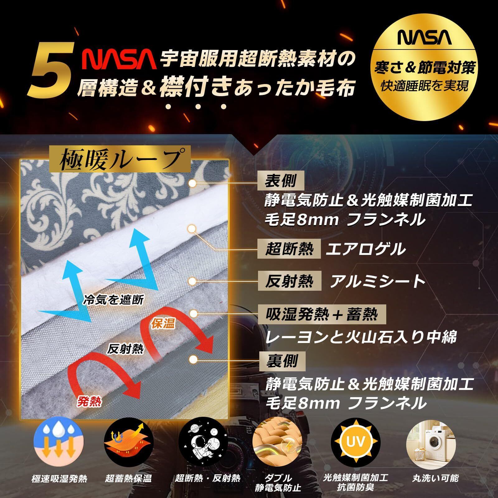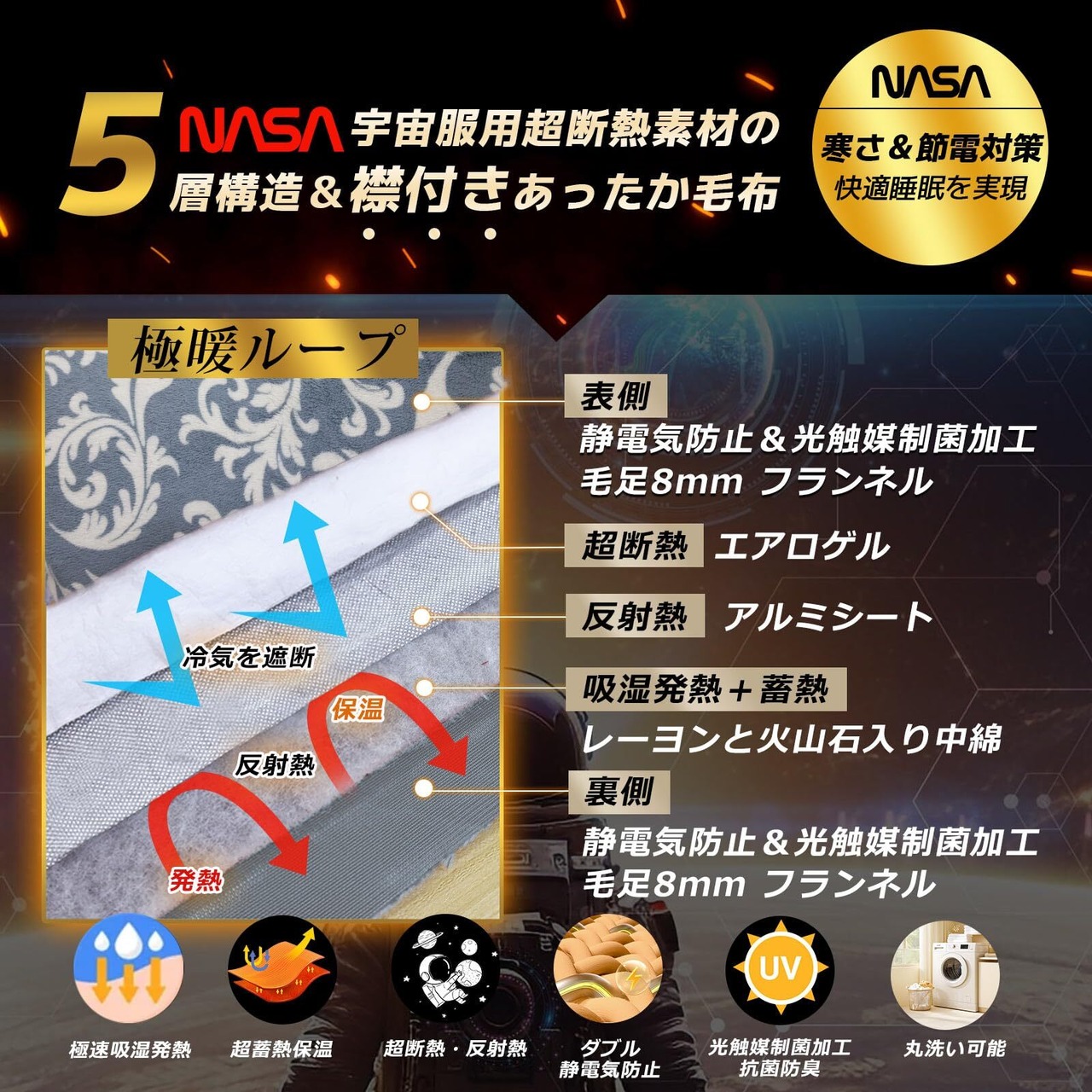 【極暖ループ設計:5層構造&襟付き】この毛布は5層構造のデザインです。①層目:高密度の<静電気防止・光触媒制菌加工>フランネル表地、②層目:NASAの宇宙服にも使用される<超断熱>エアロゲルシート、③層目:柔らかい<防音・断熱>アルミシート、④層目:<超吸湿発熱>レーヨン&HEATSTARsolar<蓄熱保温>中綿、⑤層目:高密度で静電気防止と光触媒制菌加工のフランネル裏地です。この5層でしっかり保温のループを生成し、さらに、冬用毛布は襟付き仕様で、首と肩の接触部分に柔らかくて二重構造の衿を付けて、冷気の侵入を防ぎ、さすがに上品な暖かくふわふわ安眠ブランケットです。