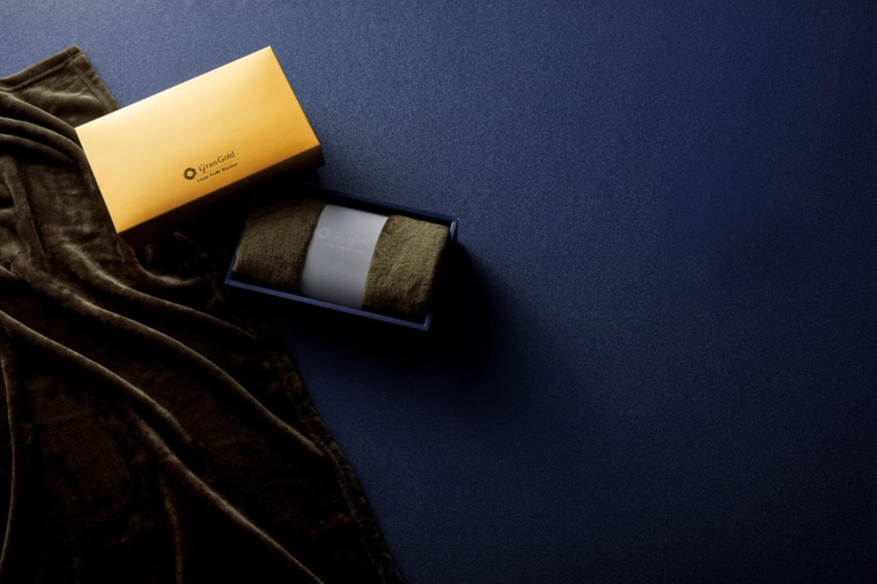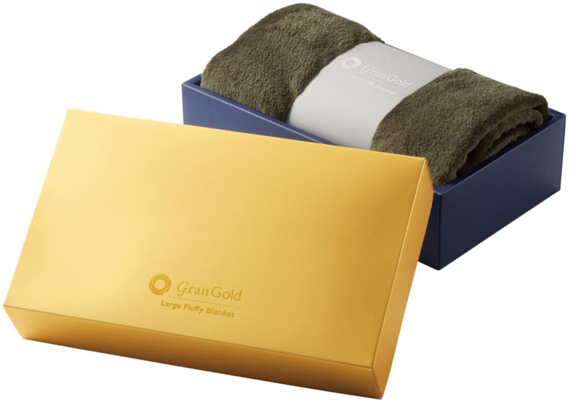 煌めくゴールド箱入りのギフト商品。積み上げるだけで注目度高まるディスプレイに。肌触りの心地よさが魅力のブランケット。