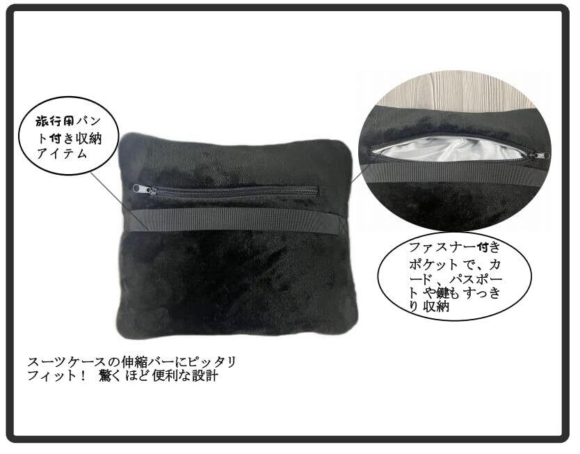 本体と収納袋が一体となったデザインで、約30 x 25 x 5cmにコンパクトに収納可能。背面には便利なベルトが付いており、スーツケースやリュックに簡単に取り付けて携帯できます。さらに、内ポケットにはスマホや鍵、財布などの小物を収納でき、アイマスクも付属しており、旅行や移動時に便利です。
