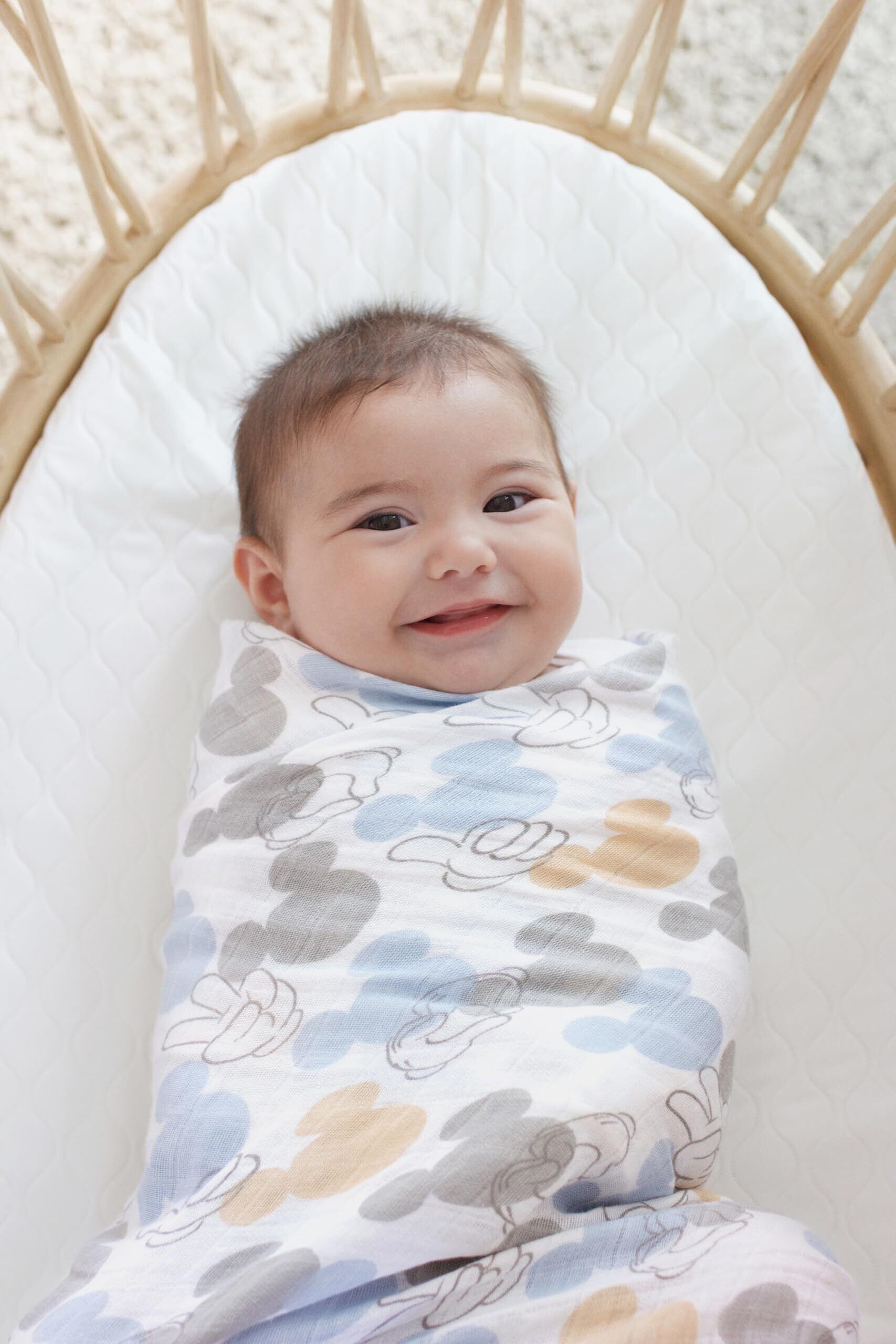 aden + anais(エイデンアンドアネイ)を代表するコットンモスリン素材で作られたディズニーベビーコレクションのスワドル。愛らしいディズニーキャラクターたちがデザインされています。 実用的な3枚セットで、毎日の育児に欠かせないアイテムです。 コットンモスリンは、伝統的におくるみとして愛用されてきた通気の良い素材。細やかな織りが特徴で、ムレを防ぎながら、体温調整がまだ難しい赤ちゃんを快適にサポートします。 スワドルを使って赤ちゃんを優しくしっかり包むことでモロー反射を抑え、まるでママのおなかの中にいるような安心感を与えられるといわれています。 エイデンアンドアネイのスワドルは、ダブルガーゼの柔らかさが魅力。赤ちゃんのお肌に優しく、使うたびに心地よさを実感できます。 おくるみとしてだけでなく、ベビーカーの日よけや授乳ケープ、おむつ替えシート、プレイマット、吐き戻しの汚れカバーとしても活躍します。 大判サイズなので多用途に使え、外出時もコンパクトにたたんで持ち運べる便利さが魅力です。 ■ 通気のよいコットンモスリン生地 ■ 洗濯機で簡単に洗え、いつも清潔に保てます ※タンブラー乾燥はお避けください ■ 赤ちゃんのお肌に優しいソフトな風合い ■ 多目的に使える便利な大判サイズ ■ ダブルガーゼで柔らかさが違う 何枚あっても重宝するスワドルは、赤ちゃんが大きくなった後もブランケットやタオル、ベッドシーツなどとして長く活躍します。 出産祝いにぴったりな、ブルーの専用ボックス入りでご用意しました。