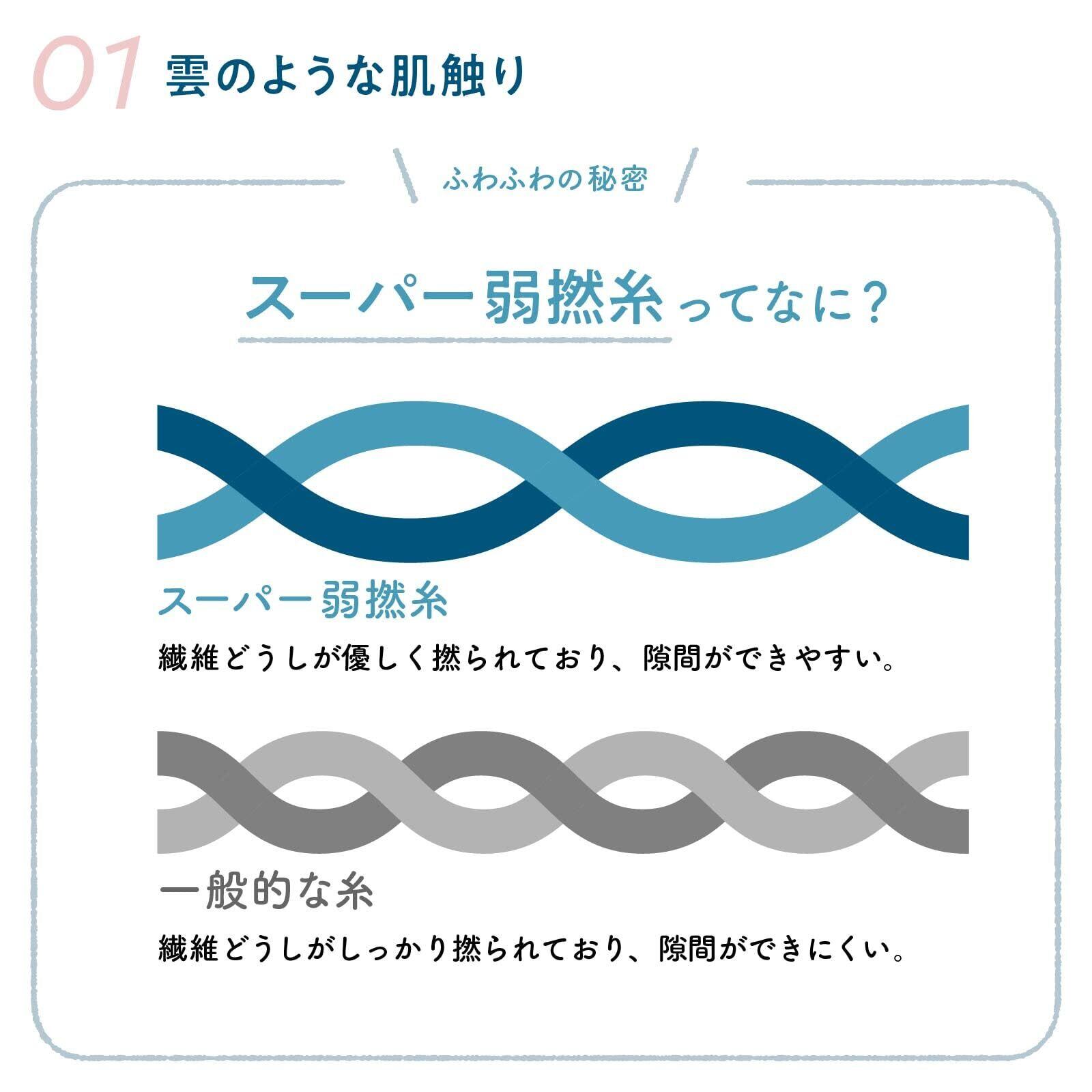 【まるで雲のような触り心地】 厚手で贅沢なボリューム感と雲のようにふんわりした触り心地です。糸撚りを最小限に抑えたスーパー弱撚糸を使用し、もちもちの握り感も実現しました。綿100%素材ならではの通気性と吸湿性があるため肌にまとわりつきづらく、夏の寝苦しい夜も快適にお使いいただけます。