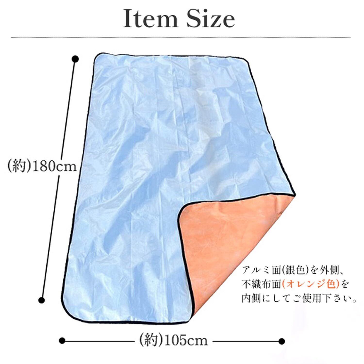 【サイズ】 サイズ:(約)180cm×105cm 折りたたみサイズ:(約)27cm×19cm 【素材】 外側:アルミ 内側:不織布 【カラー】 外側:シルバー 内側:オレンジ 【重量】 (約)156g