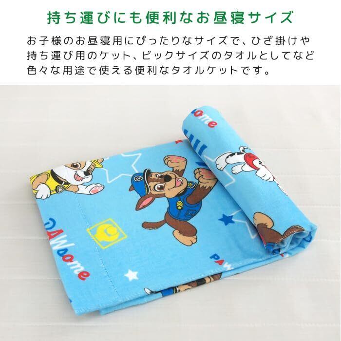 お子様のお昼寝にピッタリのタオルケット/パウ・パトロールの楽しいデザイン。肌にやさしい綿100%素材、表地はシャーリング加工し気持ちいいなめらかな肌さわりです。コンパクトサイズで持ち運びも簡単、レジャー・アウトドアなど色んな場面で活躍してくれる便利なタオルケットです。