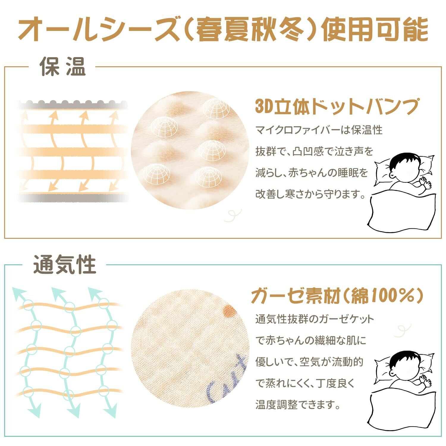 【3Dドットバンプ】赤ちゃんの繊細な肌に守り、優しく包まれたような丸い接触への物理的なホットプレスプロセス仕様です。赤ちゃんから子供、大人まで使用範囲が広く、リバーシブル仕様で一面はダブルガーゼ使用し、一面は凸凹付きのマイクロファイバーを使用しています。快適さとソフトの触感を体験できます。夏場はしっかりと汗を吸収し、冬場は暖かさを逃さず、一年を通じて使えます。