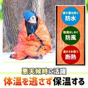 遭難や災害時の必需品!屋外で過ごす際に、雨・雪・風などによる体温の低下を防げるエマージェンシーシートです。未使用時はコンパクトに折り畳めるため、防災バッグの中を圧迫せずに持ち運べます。
