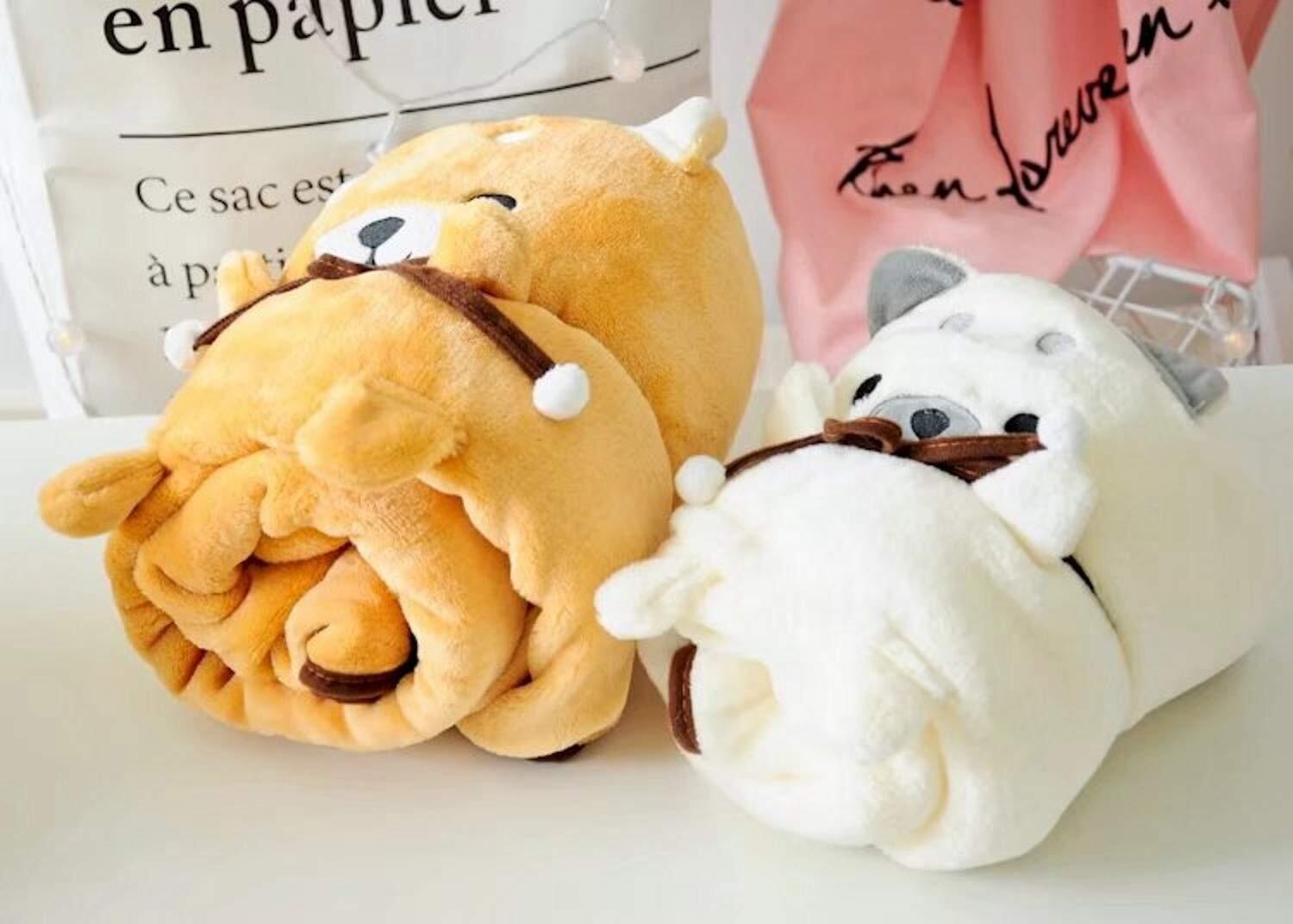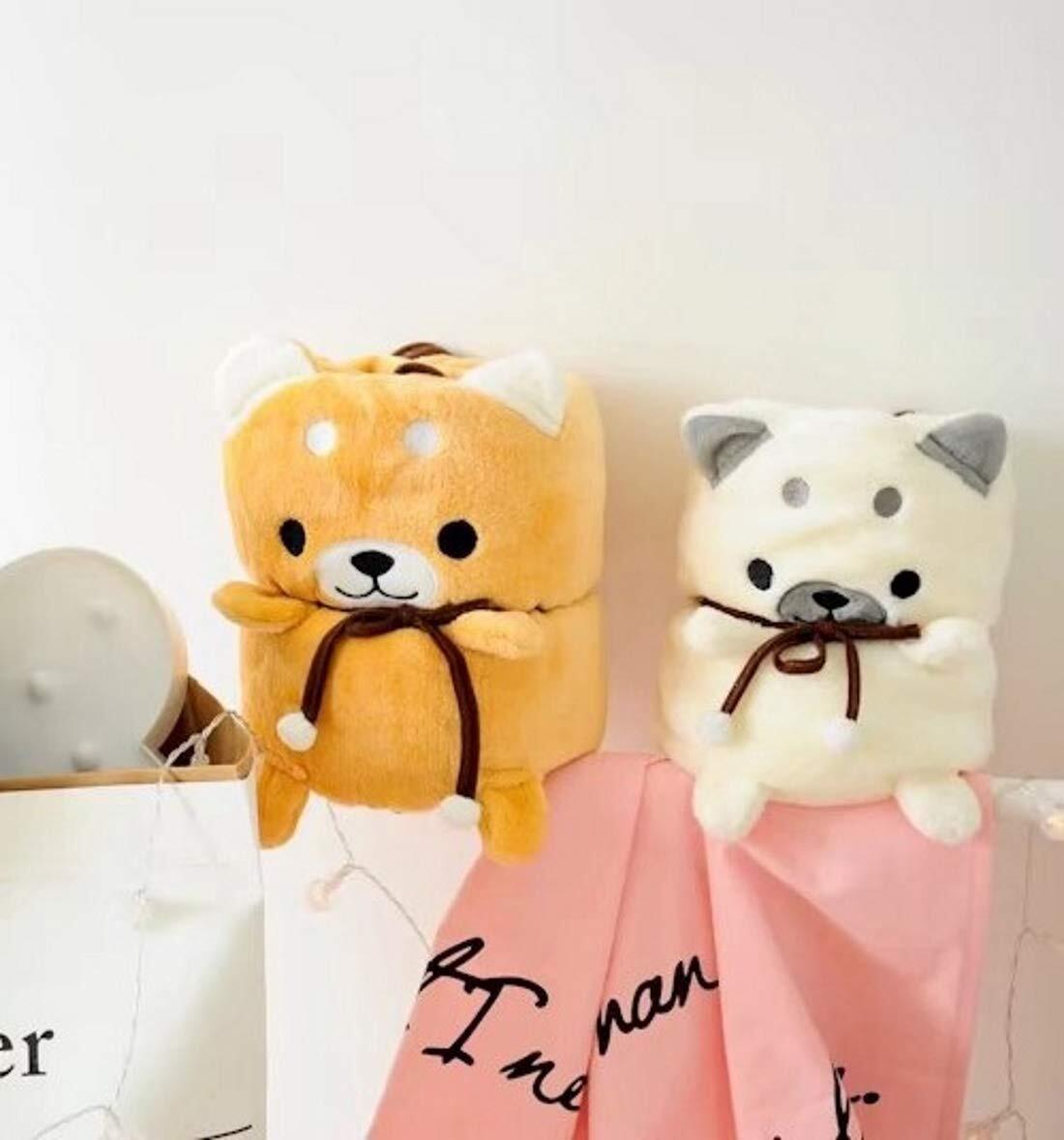 使い方は紐をくるくるとほどいて広げるだけで軽くて肌触りのいいブランケットに大変身。収納するときはくるくると巻いてヒモを結べはとってもかわいい柴犬顔のぬいぐるみに変身!インテリアとして、また抱っこしたりできる癒し系のふわモコぬいぐるみ型ひざ掛けです。