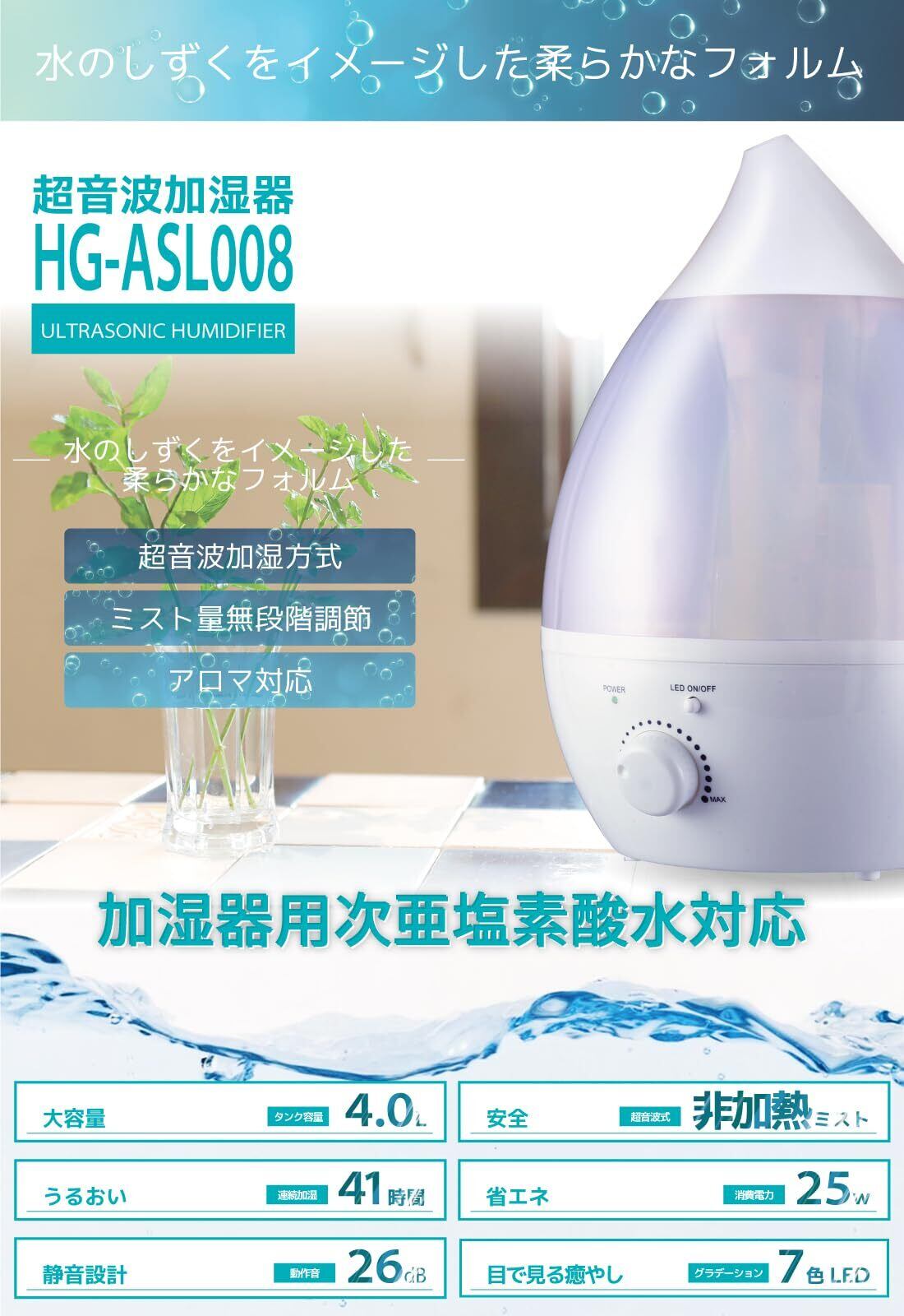 加湿器 4L 大容量 シルキーホワイト 41時間連続加湿 【 国内メーカー品 次亜塩素酸水対応 】 静音 卓上 ハイパワー 超音波加湿器 無段階加湿量調整 12畳対応 アロマ対応 4リットル しずく型 大型 7色変換LED 空焚き防止 360度回転ノズル HG-ASL008
