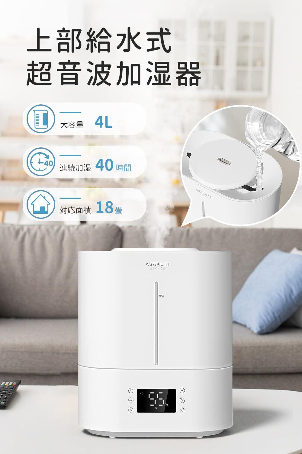 ASAKUKI 加湿器 大容量4L 超音波式 アロマ対応 自動湿度調整 40時間連続稼働 上から給水 静音 タイマー 睡眠モード ナイトライト 空焚き防止 ミスト量3段階 加湿量最大200ml/h 18畳対応 リモコン付き 寝室用