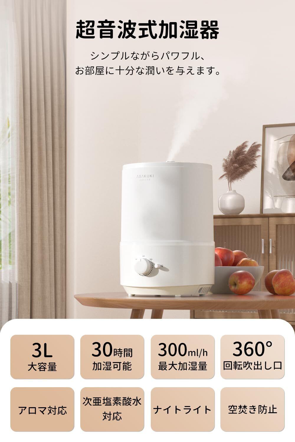 ASAKUKI 加湿器 卓上 小型 アロマ対応 超音波式 大容量3L 次亜塩素酸水対応 上から給水 ナイトライト 静音 空焚き防止 お手入れ簡単 加湿量最大300ml/h 6-12畳対応 強力加湿 乾燥防止 寝室用