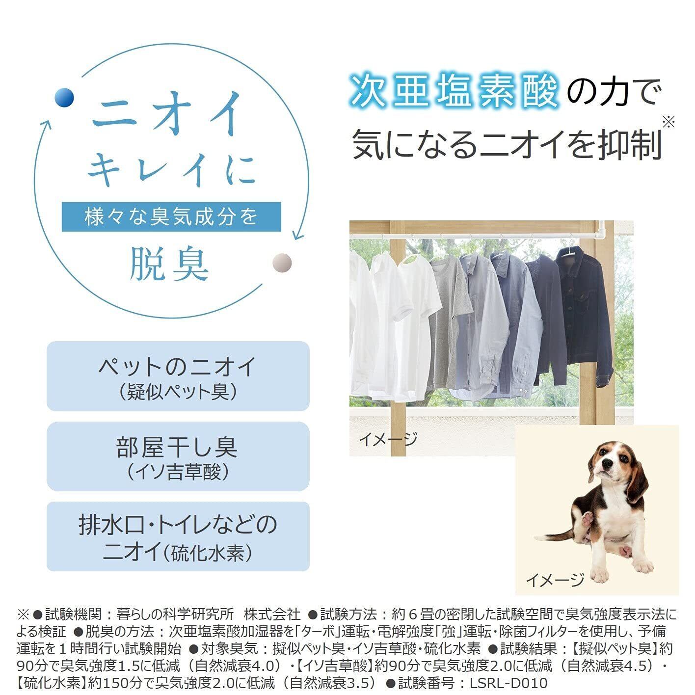 お部屋の空気が本体に吸気され、次亜塩素酸が含浸した除菌フィルターを通ることでペットのニオイ・部屋干し臭・排水口やトイレなどのニオイを抑制します。