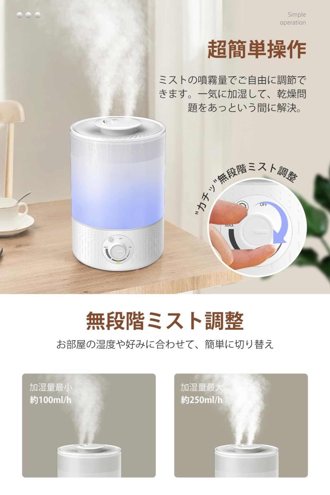 【54時間連続作動・無階段ミスト調整】最大約54時間の連続運転!加湿力と静音性を兼ね備えており、ミスト量は約100ml/hから最大250ml/hまで!噴霧量を最大にしても9時間加湿が持続します。無階段ミスト調整ボタンで、複雑なタッチスクリーンを必要とせず、ミストの噴霧量でご自由に調節できます。