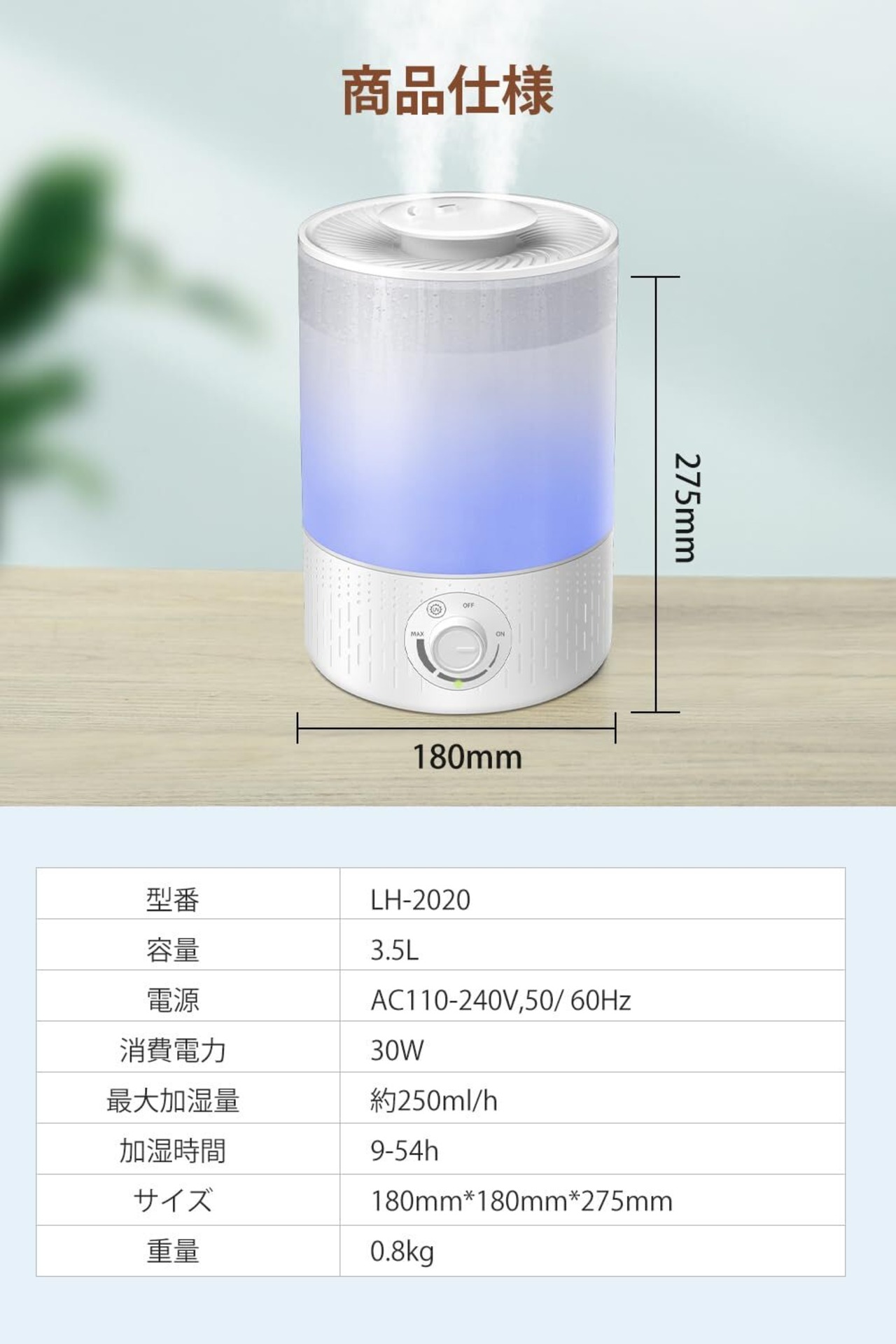 加湿器 卓上 大容量 3.5L 【2024新設計 & 54時間連続作動 & UVライト除菌】 超音波式 加湿器 上から給水 無階段ミスト調整 アロマ おしゃれ ダブル吹出口 360°回転 水漏れ防止 お手入れ簡単 空焚き防止 空気清浄 静音 乾燥対策 花粉対策 PSE認証済み オフィス/寝室/家庭用 (ホワイト)
