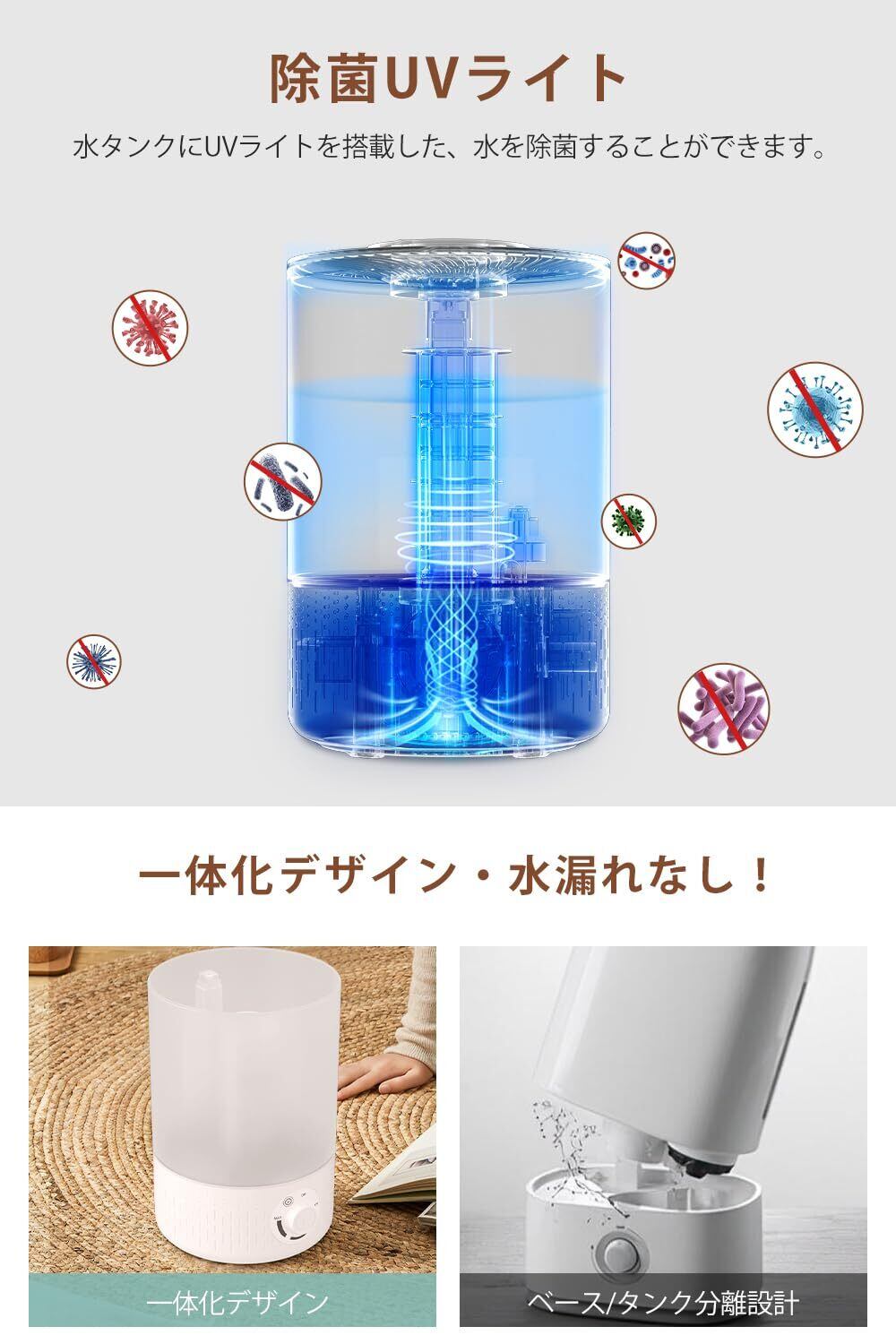 【UV除菌・アロマ対応加湿器】UVライトは抗菌機能があり、UVボタンを触れるとライトが点灯し、水中の細菌を99%取り除きます。この加湿器は清潔なミストを噴出することができます。また、水溶性のアロマオイルにも対応しており、お好みのアロマオイルをタンクに入れることで部屋全体に心地よい香りが広がります。(注意:次亜塩素酸水を使用したい場合は希釈してください。50ppm以下の濃度がおすすめです)