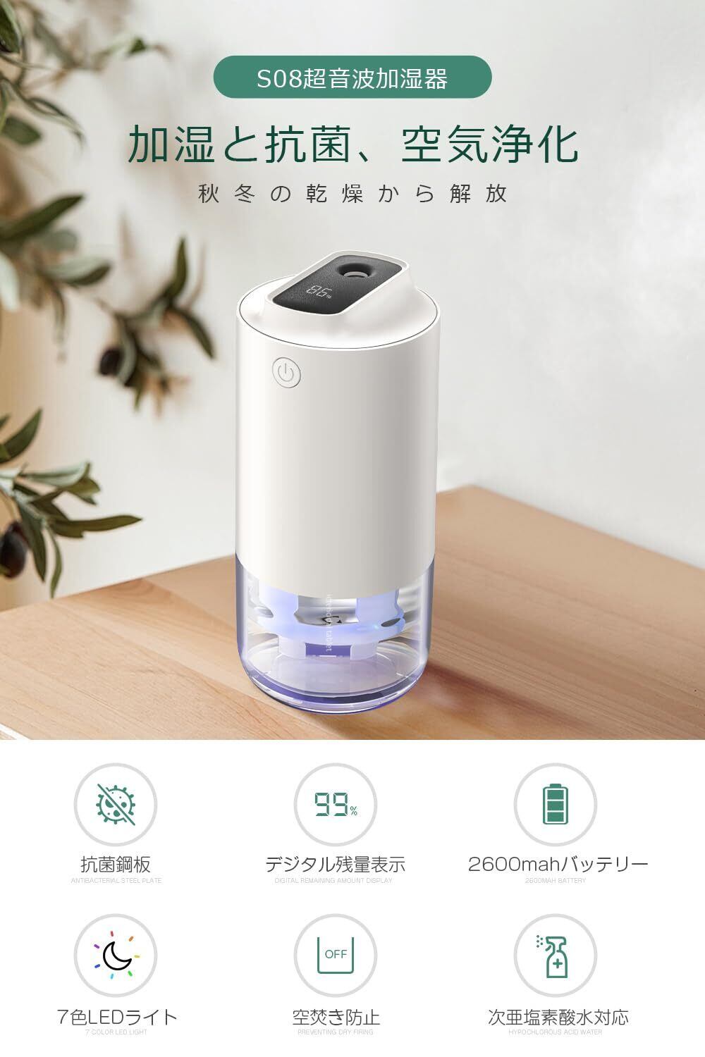 【2024新登場&抗菌鋼板&Type-C充電式】 加湿器 卓上 小型 デジタル残量表示 2600mah大容量バッテリー 卓上加湿器 除菌 大容量 超音波式 次亜塩素酸水対応 車載 静音 軽量 コンパクト コードレス 2段階ミスト 7色LEDライト 車用/部屋/寝室/オフィス用 クリスマス/誕生日/新年 プレゼント