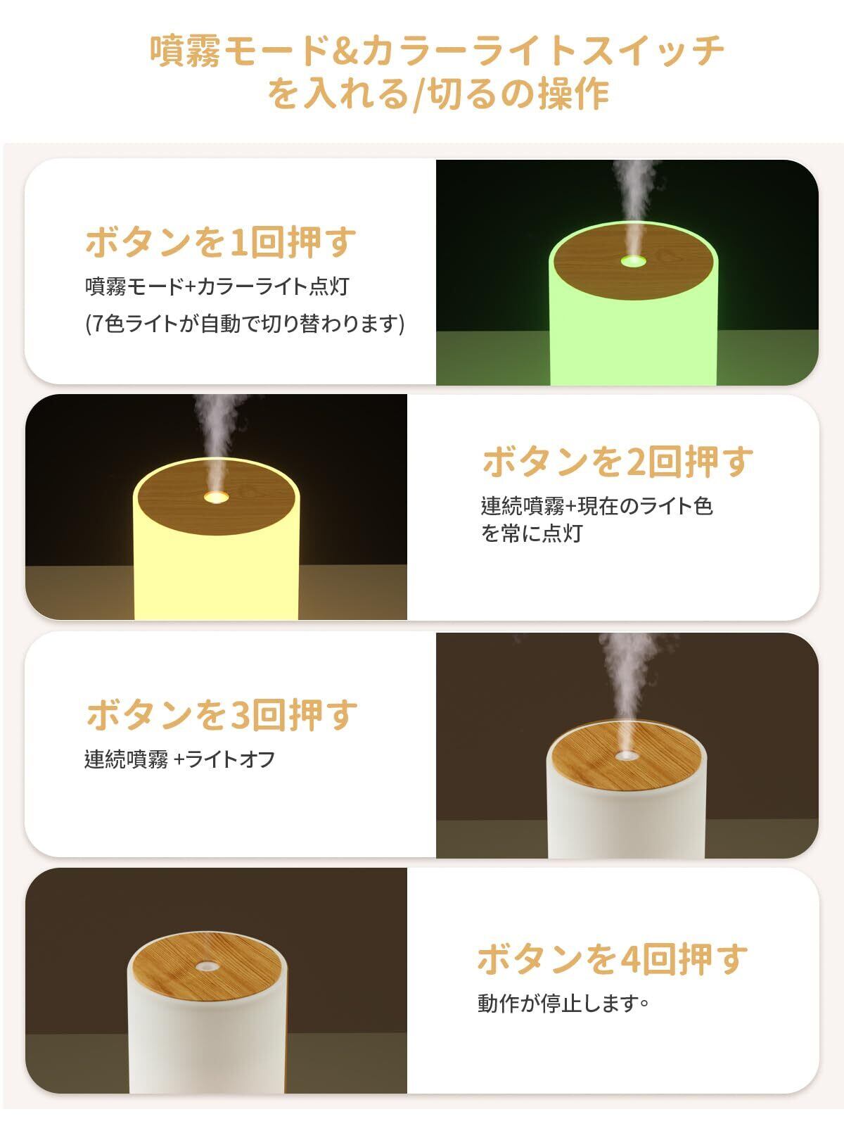 【ナイトライト アロマ対応 加湿器&パーソナライゼーション】小型加湿器は七色のLEDライトがあり、単色固定またはカラーサイクルモードを選択できます。加湿器のライトが夜間の睡眠の妨げになる場合は、ライトをオフにして加湿機能を楽しむこともできます。お好きなエッセンシャルオイルを入ればフレグランスも楽しめます。気分に合わせて好きなライトやエッセンシャルオイルを使い、最も快適な雰囲気を作り出す。超音波振動板を使用して振動と加湿を行うアロマテラピーマシンです。したがって、純粋なアロマテラピーエッセンシャルオイルと水溶性エッセンシャルオイルの両方を添加することができ、非常に便利であり、超音波加湿器の霧化機能にはまったく影響を与えません。