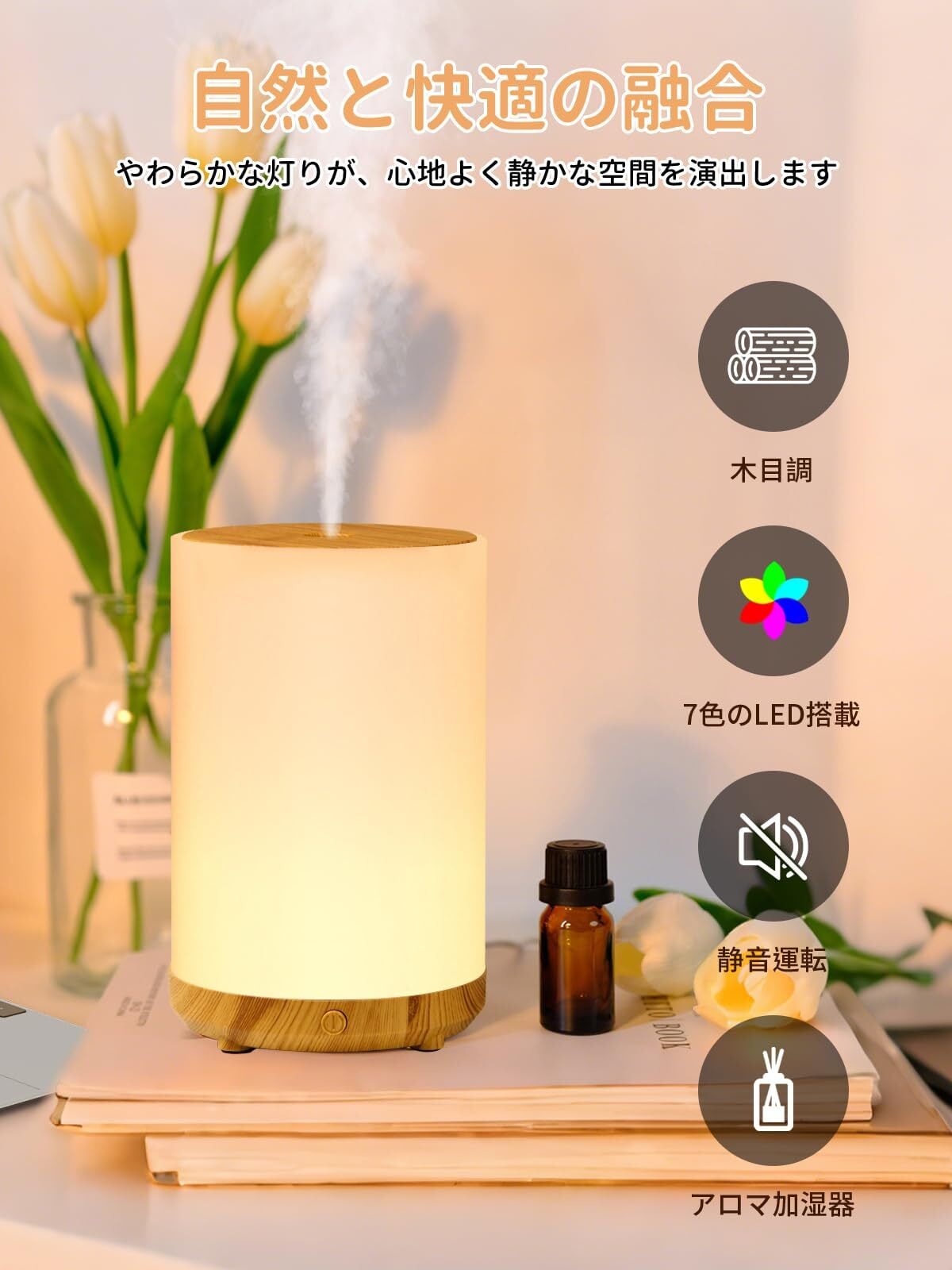 【2025発売新モデル・一台多役・木目調】加湿器 小型 アロマディフューザー 次亜塩素酸水対応 除菌 アロマ対応 超音波式 加湿器 卓上 LEDライト7色 お手入れ簡単 静音 省エネ 空焚き防止 コンパクト お手入れ簡単 6-9畳対応 乾燥対策 寝室 部屋用(ホワイト)