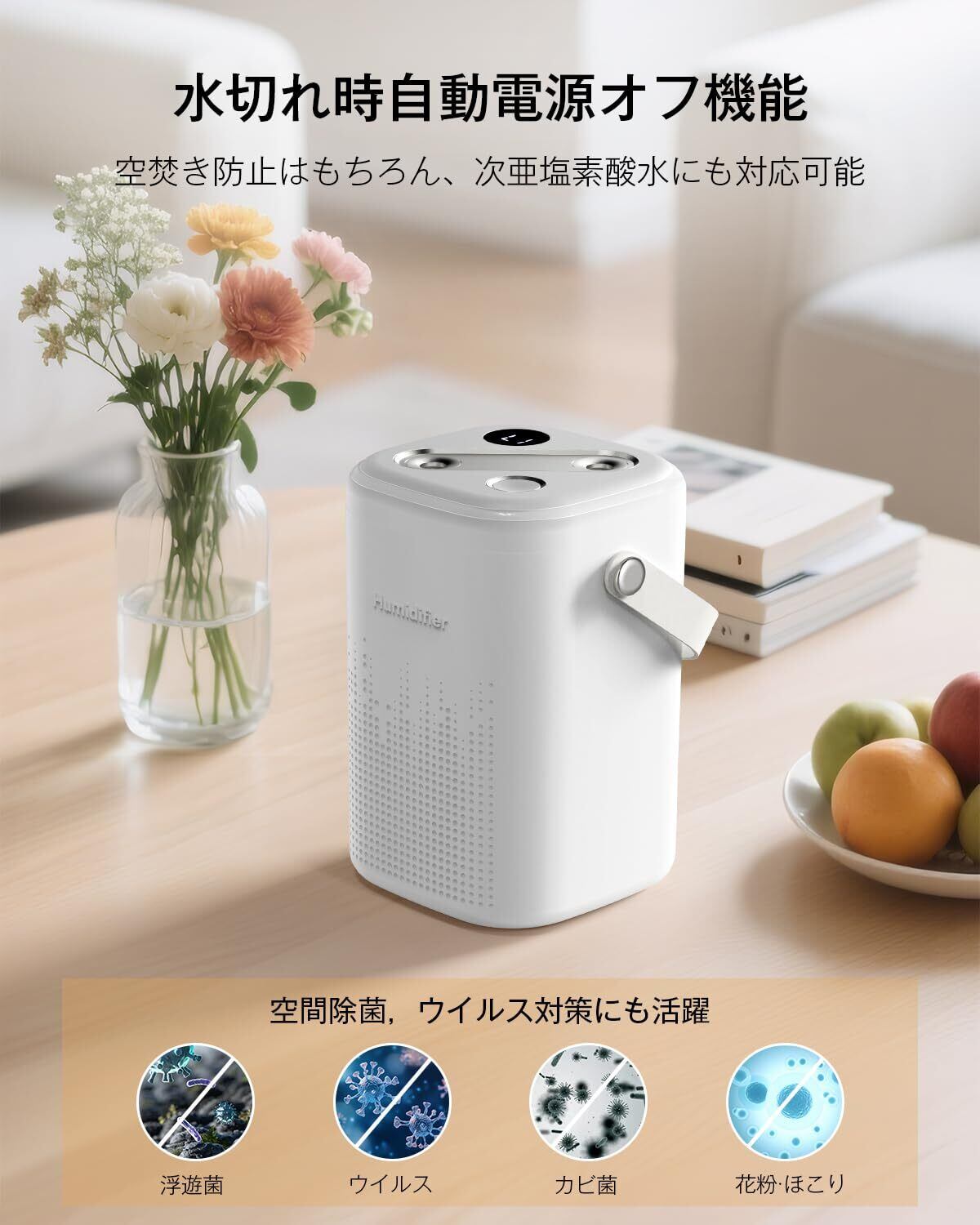 【1.3L大容量加湿器&多重安全機能】Zykifyの加湿器は1.3L の大容量タンクを搭載し、上部の蓋を簡単に開けるだけで加水ができるため、手間がかからず使いやすい。さらに水切れ時に自動で電源がオフになる機能を備え、空焚きのリスクを完全に防ぎ、長時間使用しても安心できる。次亜塩素酸水の使用にも対応しているので、清潔に保つのが容易だ。