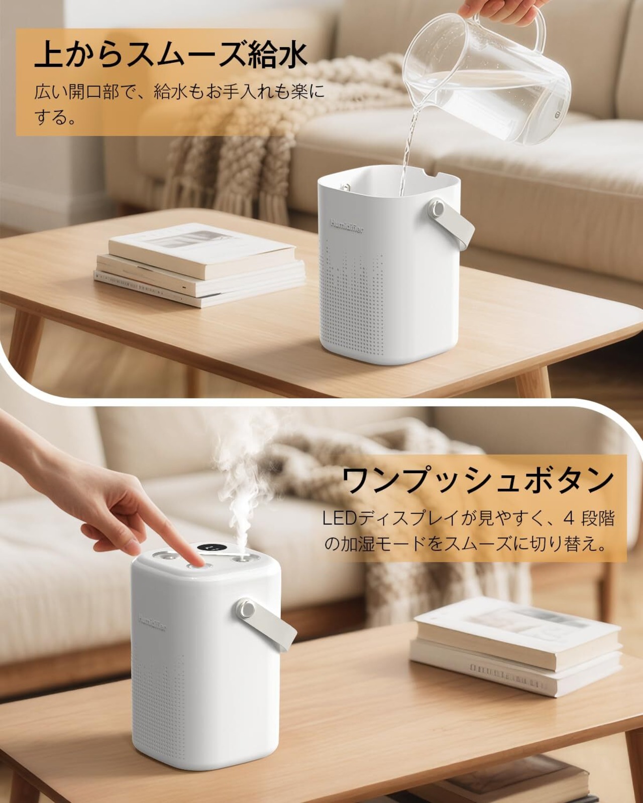4 段階の加湿モードを自由に切り替え可能で、小さな寝室から広いリビングまで、部屋の大きさに合わせて霧量を調整できる。また、季節の変化や個人の体感に応じて加湿強度を変えることも可能で、秋から冬までの乾燥期を通じて、最適な湿度環境を維持できる。