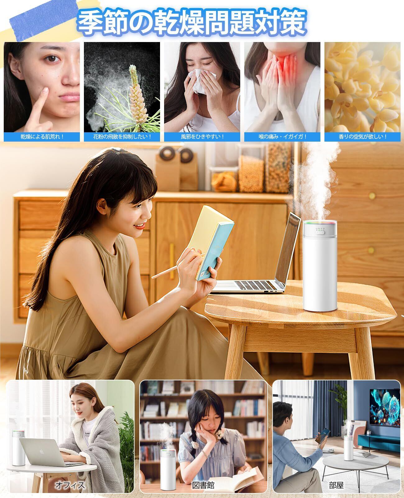 【USB給電式&1日間連続使用】超音波式加湿器はType-C給電式を採用しており、アダプターだけでなく、パソコンやモバイルバッテリーからも電源がとれるからどこでも使いやすいです。注意:製品は電池を持っていないので、使用する時は電源を接続してから作業する必要があります!【500ml大容量】スリムな卓上サイズなのに500ml大容量水タンクができます。一回の満給水で最大10時間の連続加湿が可能です、給水の手間を省ける!大容量加湿器は上から給水とタンクを取り外して蛇口で水を入れる二つの給水方法があり、平日の給水が楽々です。【省エネ設計】電気代は毎月あたりわずか約185円、消費電力の少ない超音波式でパワフル加湿と省エネを実現しました。【お手入れ簡単】従来品の給水口が小さくて面倒することと違って、こちらの超音波式加湿器給水口が大きいデザインになっており、死角のない円滑デザインなので、隅々まで簡単にお手入れでき、誰でも安心して簡単にお手入れできます。