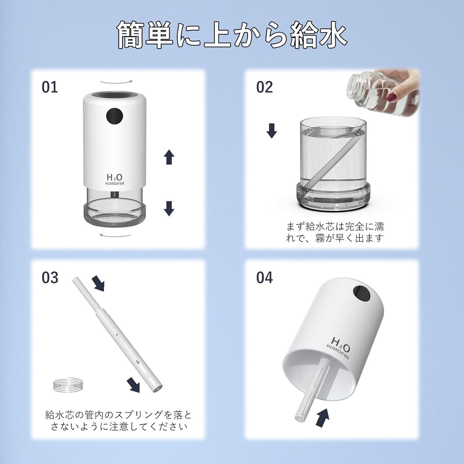 【超微細ミストで自然に潤い】乾燥が気になる方におすすめの、持ち運びできる充電式加湿器です。超音波で水を振動させ微細なミストにし、潤いを与えられます。加湿器を使って適した湿度を保つことによって、ほこりの飛散、鼻や喉の乾燥を防ぎ、暮らしのお悩み対策(乾燥対策・花粉症対策・静電気対策)としても役立ちます。動作音≤30dBの静音設計!